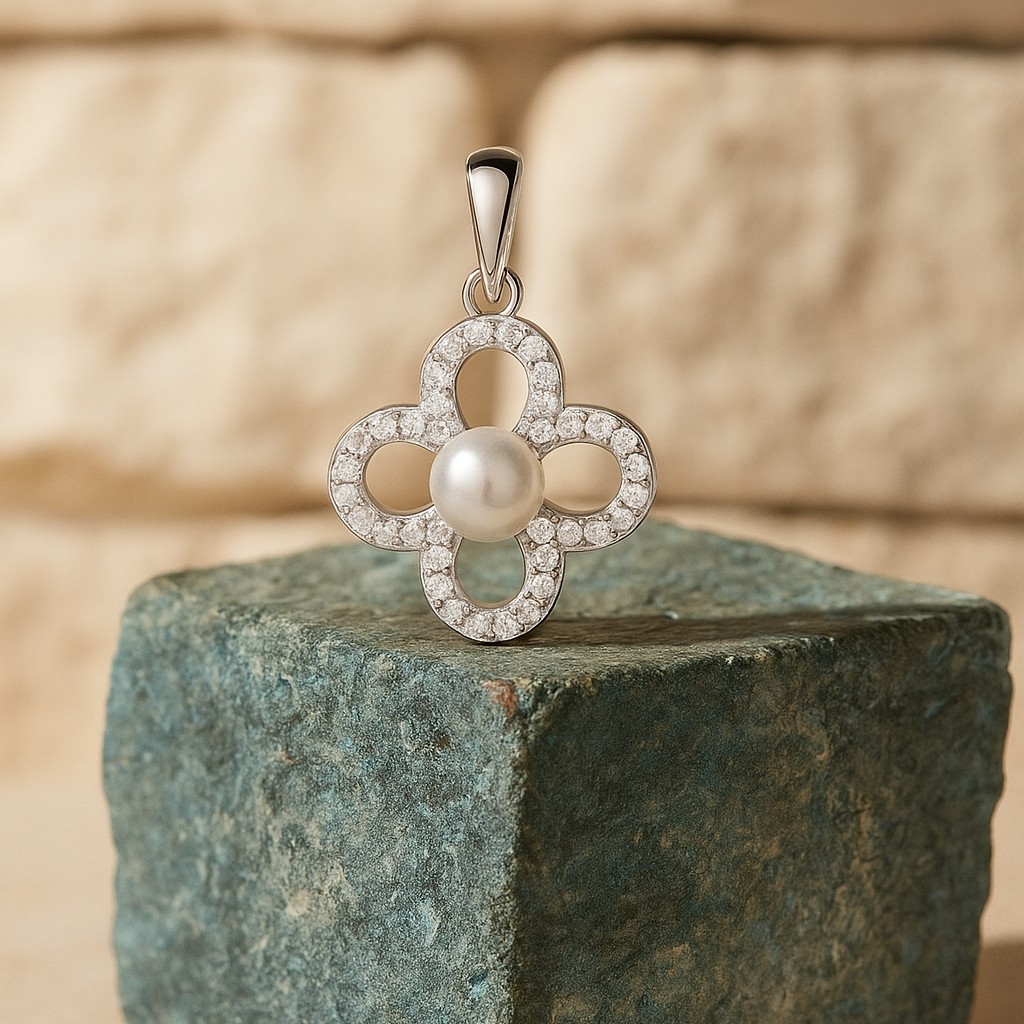 • The Étoile de Perle Pendant captures a timeless union of purity and brilliance. At its center, a lustrous pearl radiates with soft, celestial glow, surrounded by a clover-shaped motif delicately traced in VS1 diamonds. Suspended gracefully, the pendant becomes a symbol of serenity and refinement, its design echoing the elegance of starlight framed against a night sky. Whether worn with quiet sophistication during the day or as an evening statement, it whispers of grace and everlasting beauty.