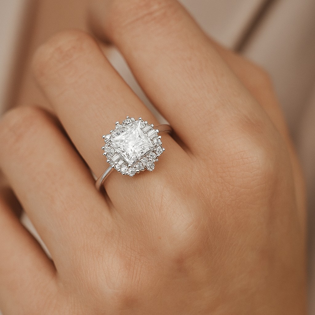 A regal square-cut diamond surrounded by a halo of baguettes and brilliant rounds. Like a crown of light, this ring exudes nobility, refinement, and the spirit of grandeur.
