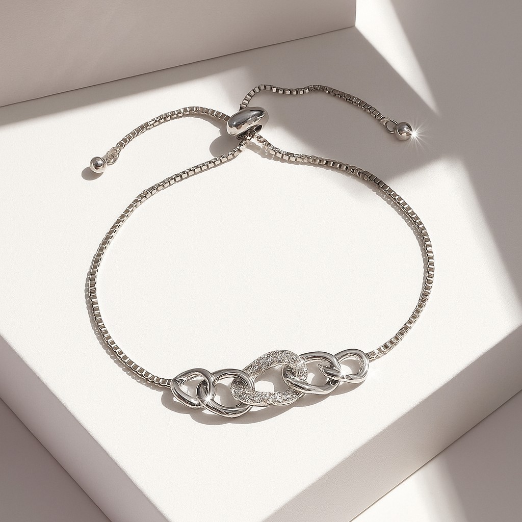 Interwoven diamond-set links forming a flowing heart motif — a symbol of eternal devotion. Modern yet tender, this bracelet carries an emotional elegance that transcends time.