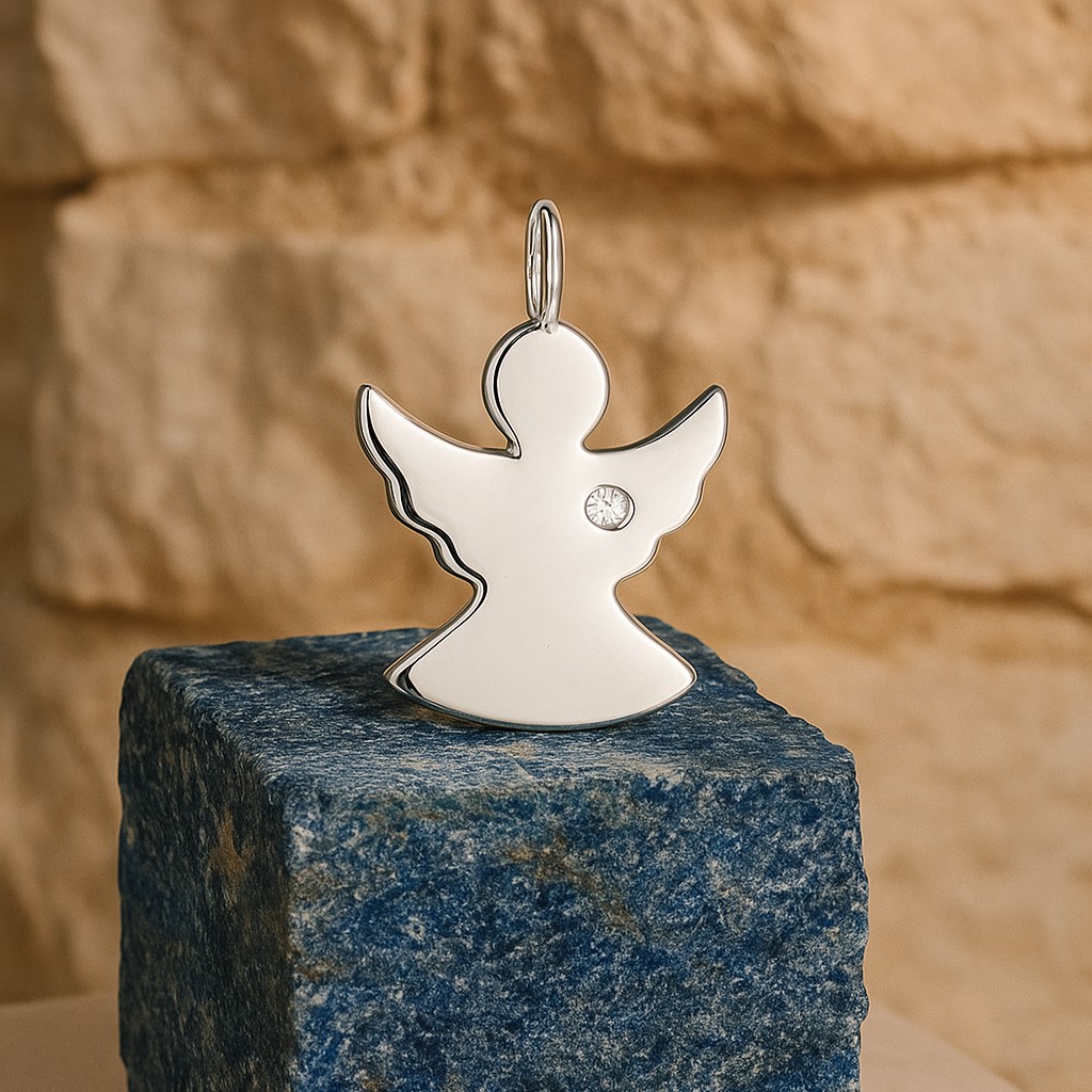 A sleek angel pendant in polished gold or silver, kissed by a single diamond—symbol of hope, faith, and unseen protection.