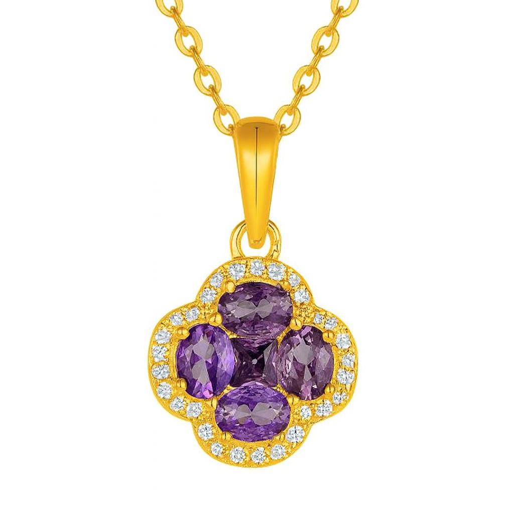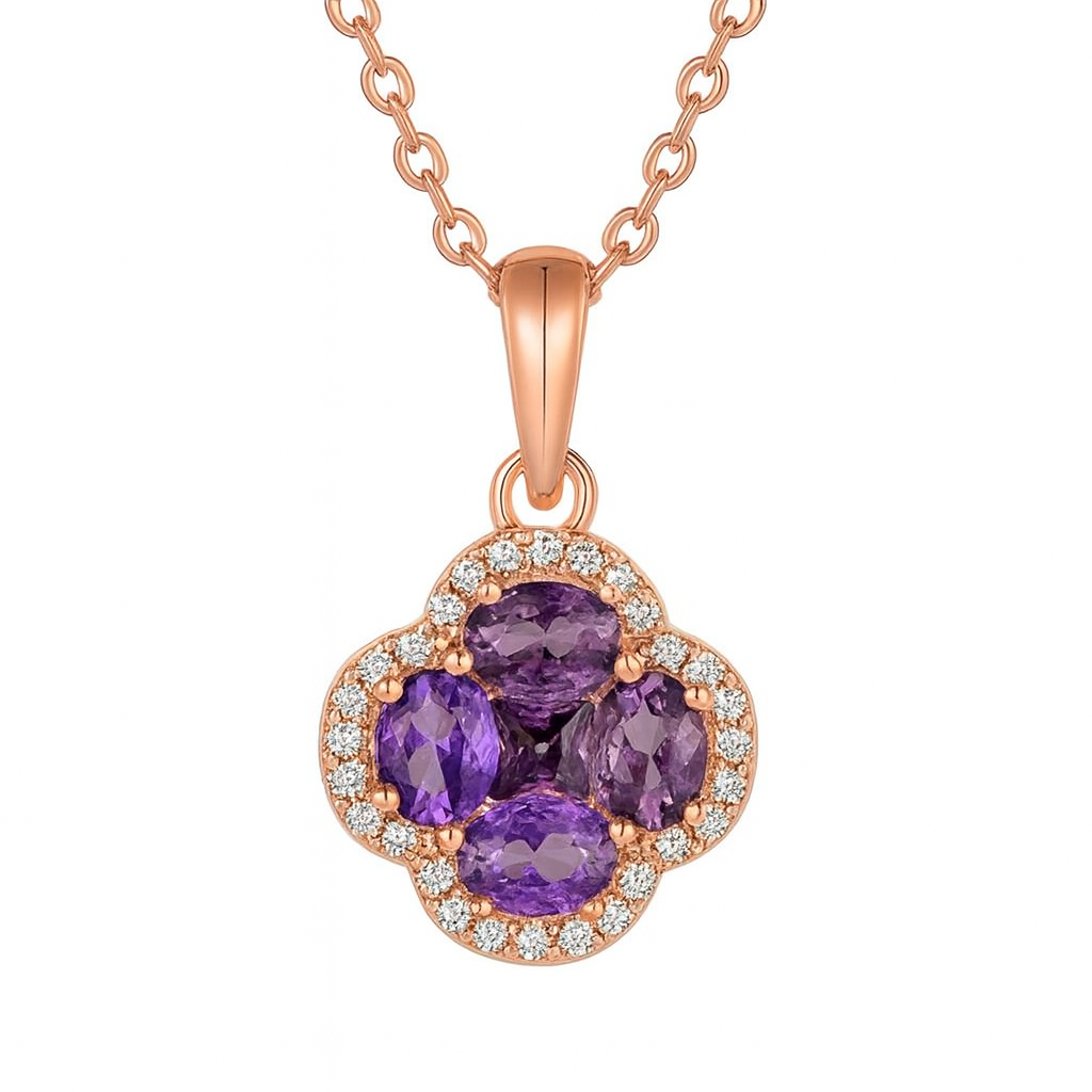 A cluster of four deep violet amethysts rests within a soft quatrefoil silhouette, surrounded by a sparkling halo of VS1 diamonds. This pendant embodies refined elegance, symbolizing growth, serenity, and inner strength. Suspended gracefully from a delicate gold chain, it is a piece that transitions seamlessly from day to evening wear.