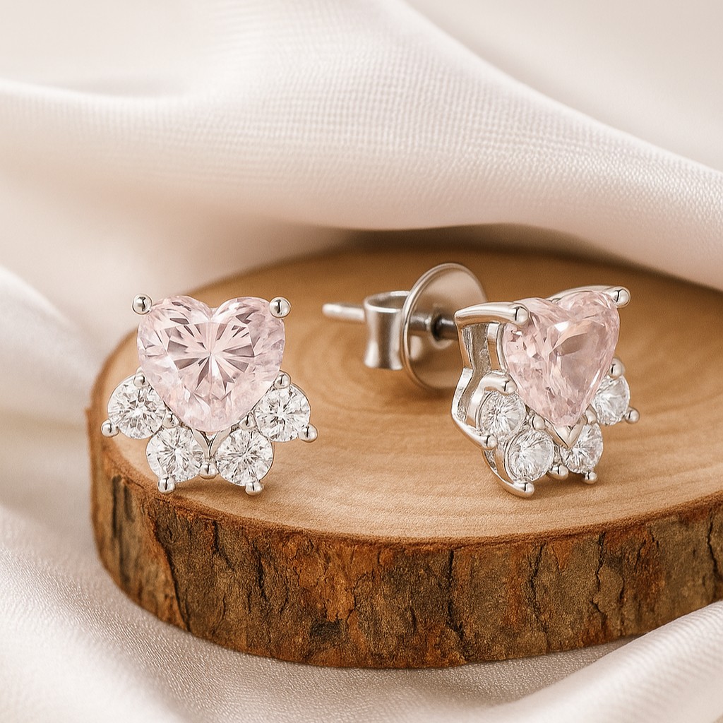 • These earrings capture romance in its purest form. Heart-cut stones radiate with warmth, delicately embraced by a sparkling halo of diamonds. Designed to frame the face with refined brilliance, they embody elegance with a whisper of whimsy. Whether chosen in soft pastels or classic white, the customizable centerpiece adds a unique, personal touch to every pair.