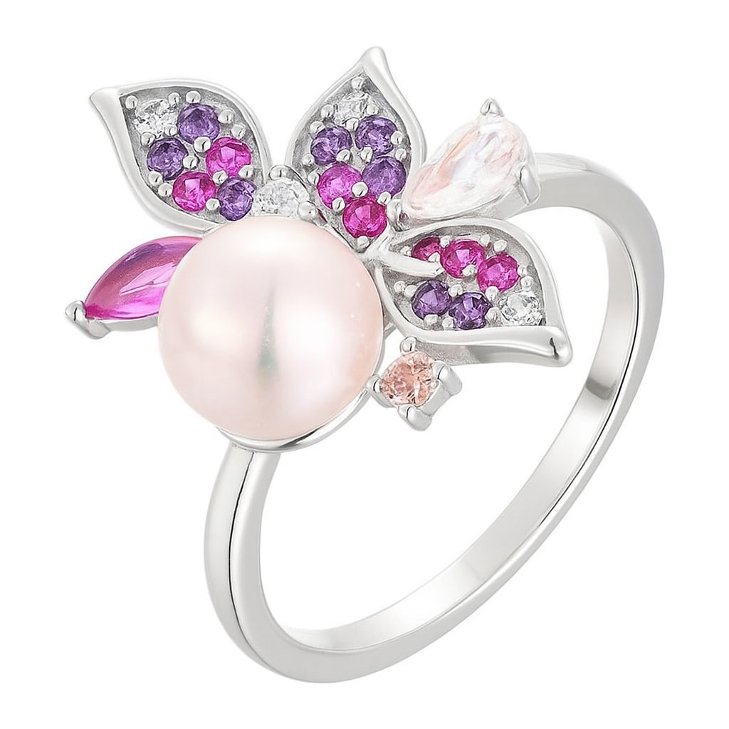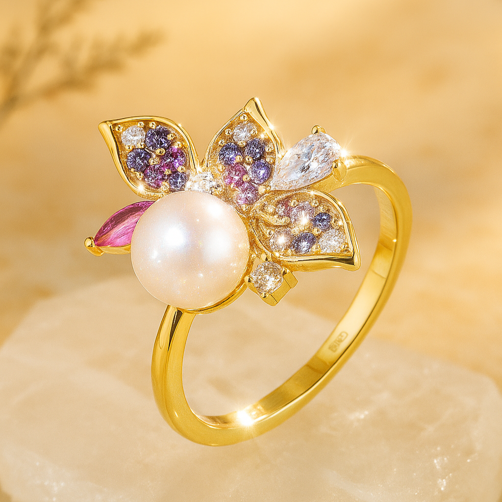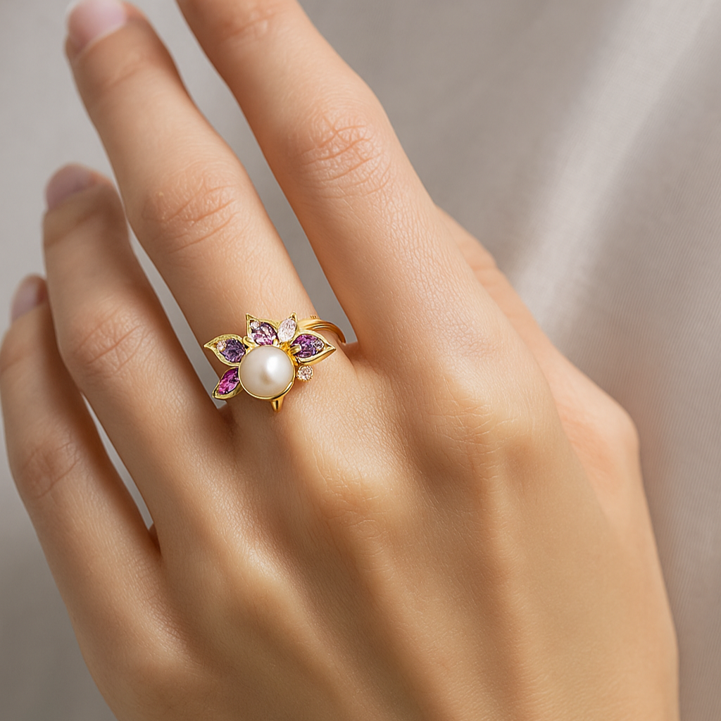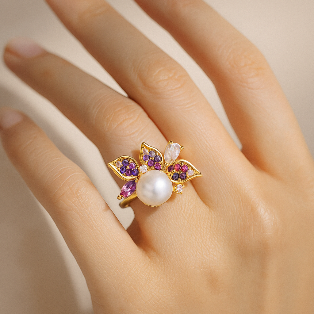 A masterpiece of balance and radiance, this 18k gold ring blooms around a luminous freshwater pearl, cradled by petals of pink sapphires, amethysts, and VS1 diamonds. Each stone is meticulously set to mirror the delicate hues of a sunrise garden. A ring of renewal, it embodies both elegance and emotional depth, making it a timeless keepsake.