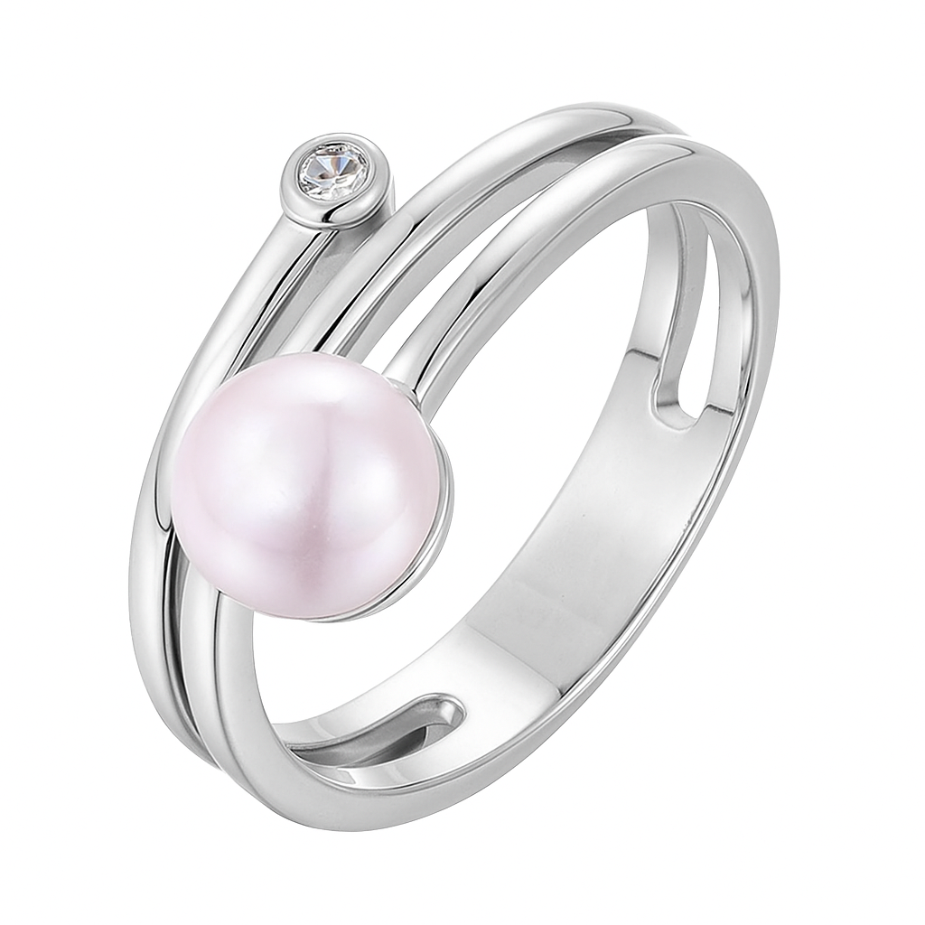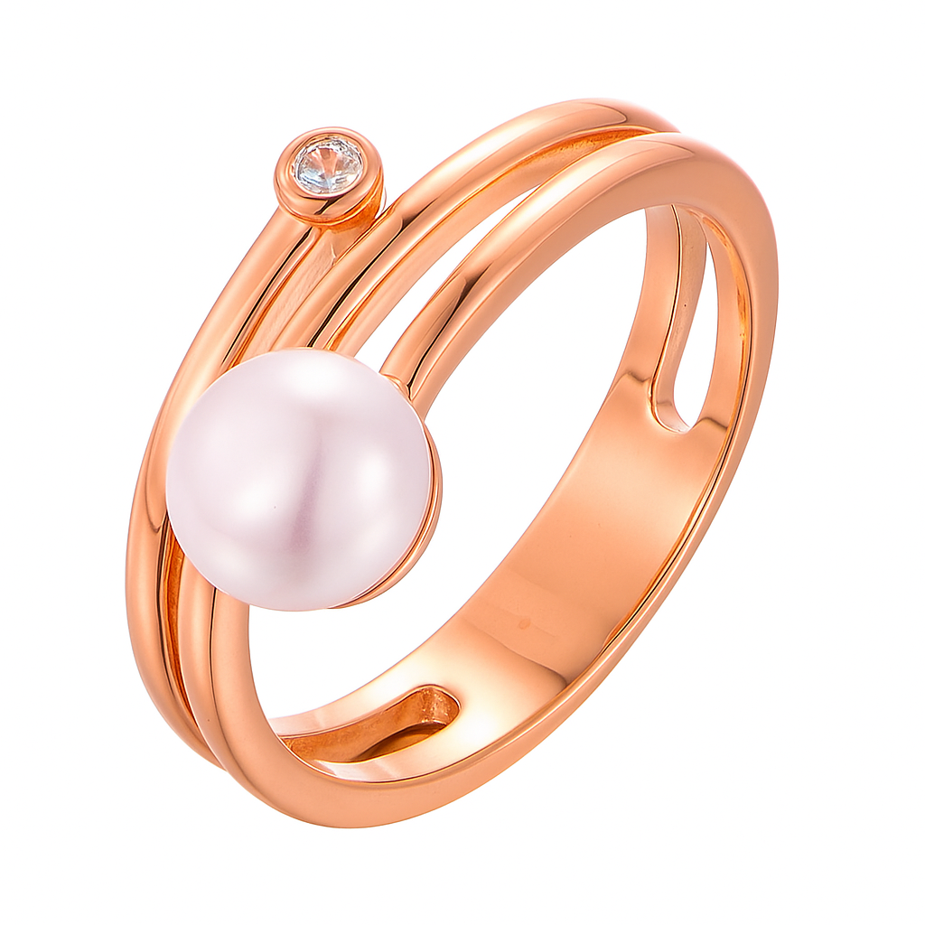 A contemporary statement of modern luxury—an iridescent pearl orbiting within a sleek golden double band, accented by a solitary diamond. A creation that bridges classic allure with bold artistry.