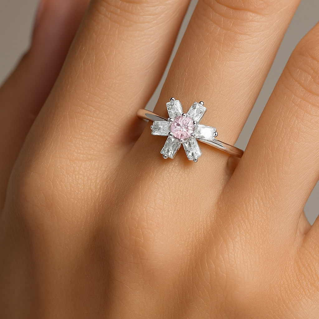 A rare floral-inspired masterpiece: baguette diamonds radiate like petals around a soft pink amethyst , evoking the glow of dawn. Choice of golds; customizable center in pink diamond, sapphire, or white diamond.
