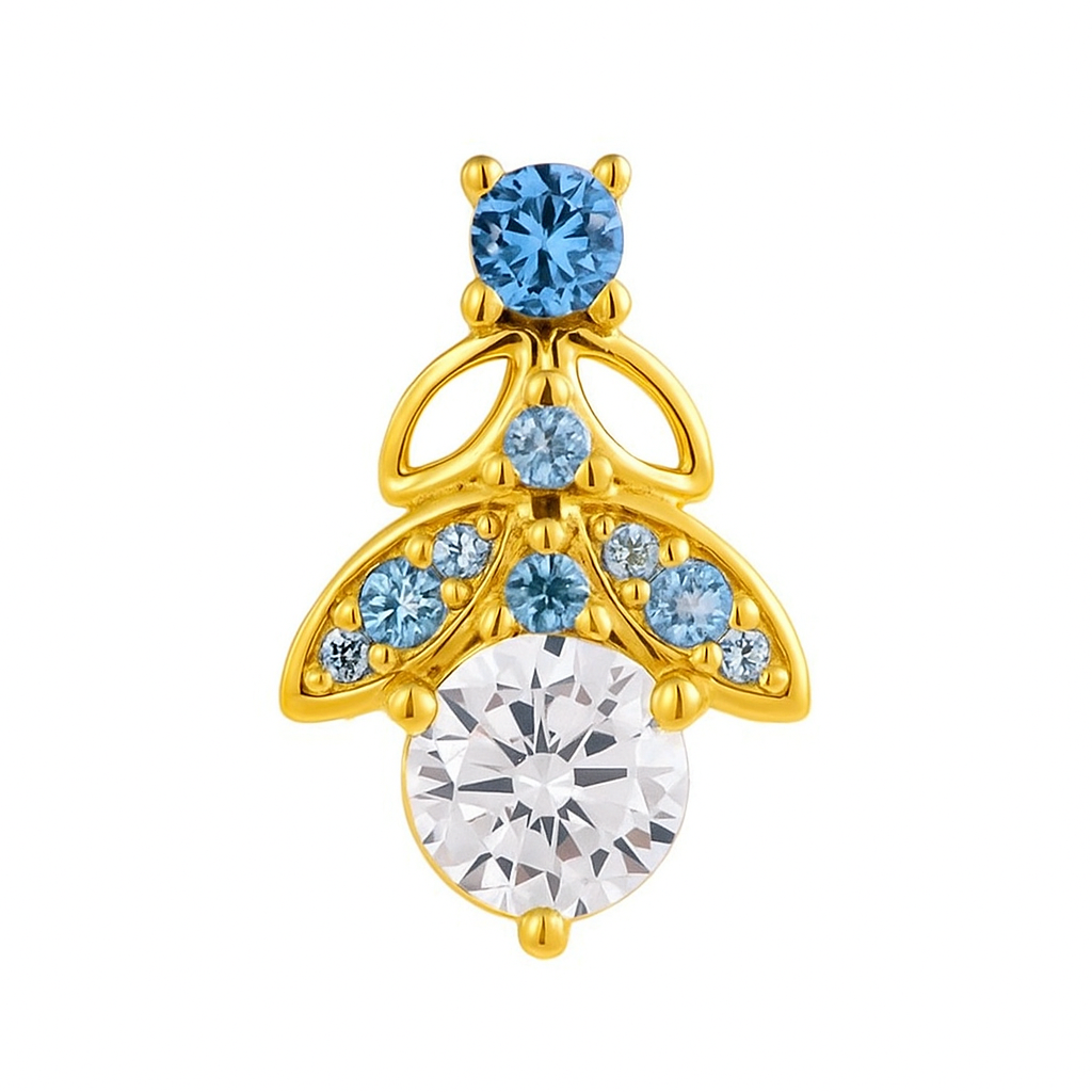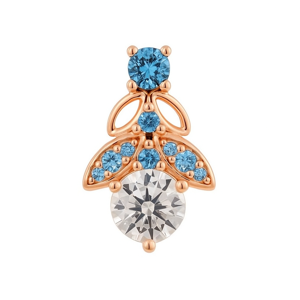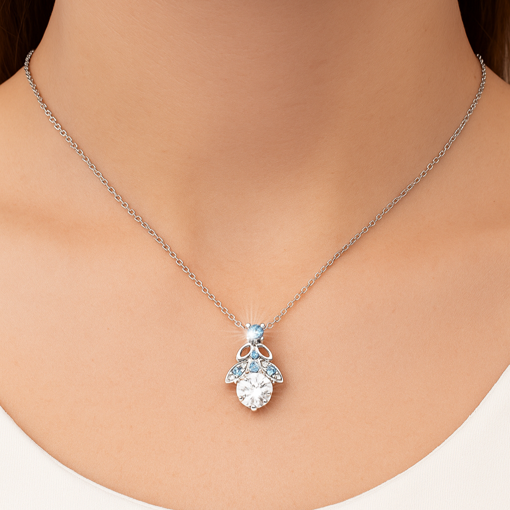 A dance of color and light, this pendant unites the serenity of blue gemstones with the timeless fire of a luminous white stone. Its design, reminiscent of a blooming flower or a guardian angel, carries an air of protection, hope, and beauty. Whether worn as a symbol of inner calm or as a radiant accent of elegance, it tells a story of grace and strength intertwined.