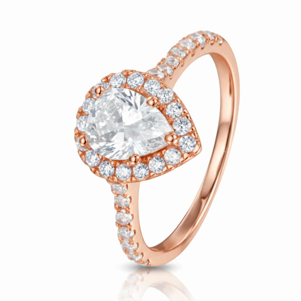 Romance takes shape in this delicate heart-cut diamond, encircled by a radiant halo of pavé brilliance. The heart, an eternal emblem of love, glows from within, its facets alive with fire and light.