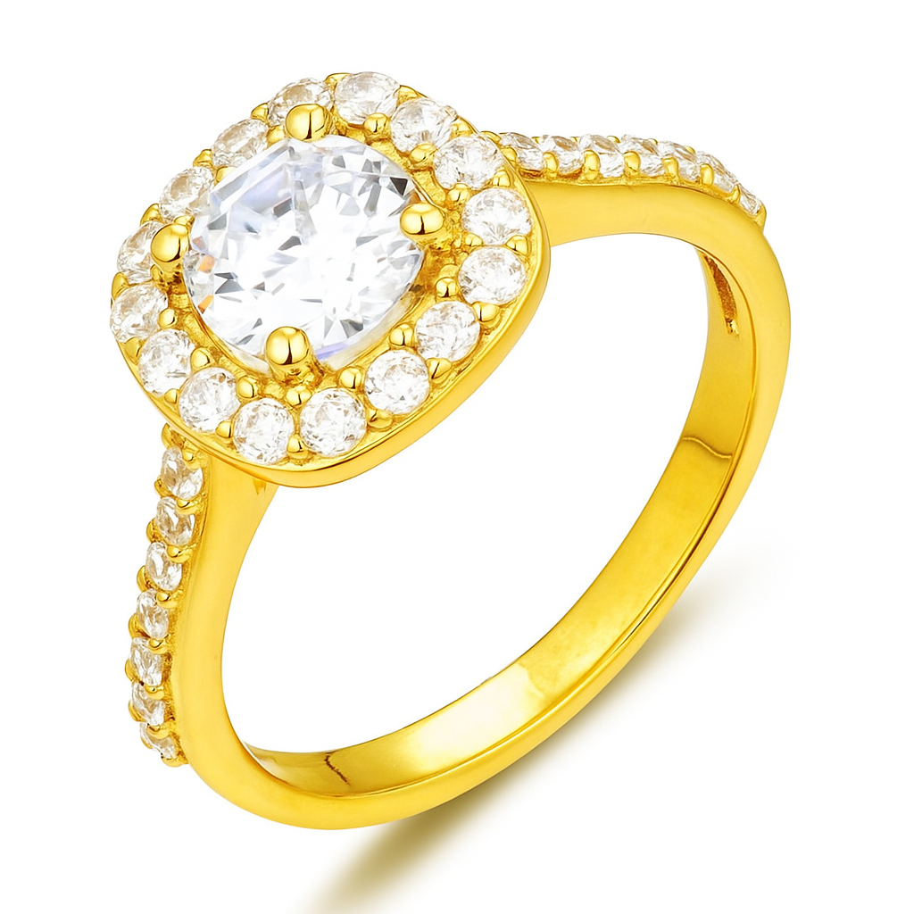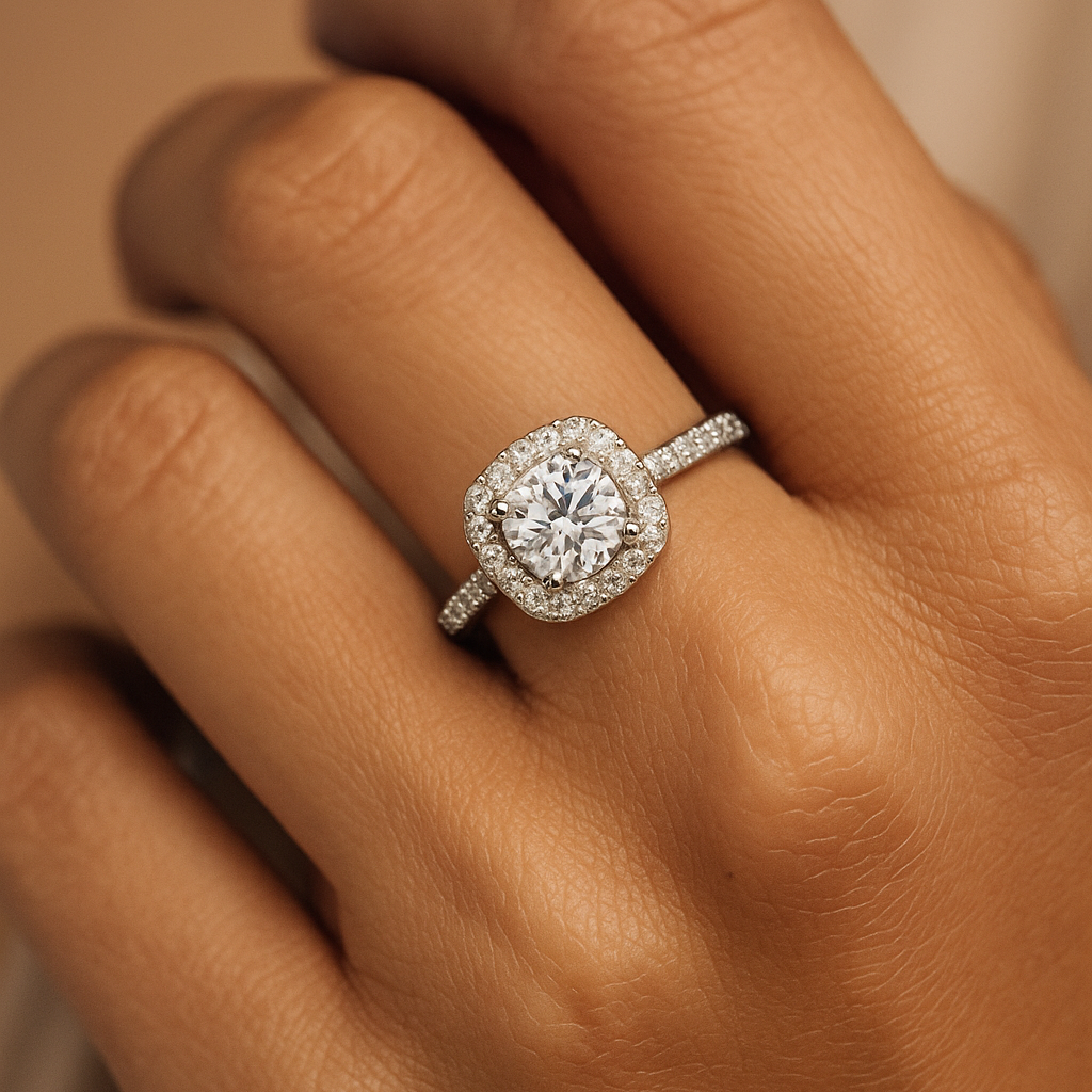 A cushion-cut center stone glows from within a radiant halo, its brilliance magnified by every surrounding diamond. The pavé band sparkles endlessly, recalling galaxies of stars in orbit around a central sun. This design is for the one whose presence lights every room with warmth and radiance.