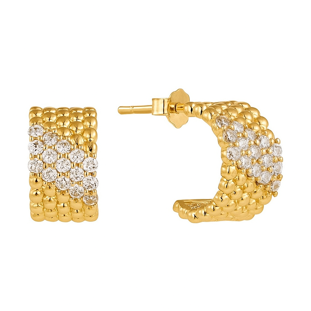 Radiant diamonds form concentric arcs across sculpted gold, reminiscent of planets orbiting a celestial core. Both modern and timeless, these earrings exude cosmic elegance, capturing the grandeur of the stars within a wearable masterpiece. Perfect for the woman who carries her universe with her, they are luminous, bold, and endlessly captivating.