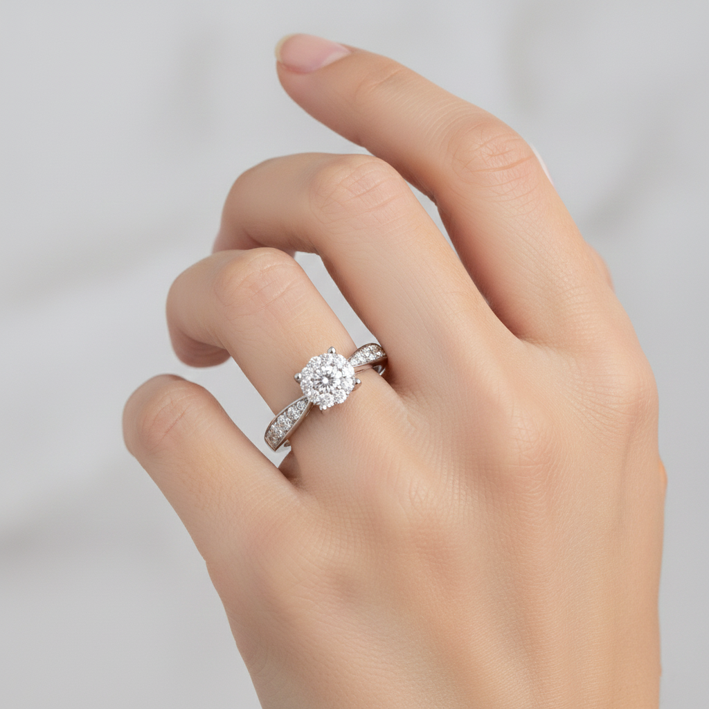A round brilliant diamond, wrapped in a delicate halo of accent stones, is set upon a band of diamond-studded shoulders. This ring captures the essence of royalty and romance — the halo like a crown, protecting and celebrating its central star. A timeless promise of devotion.