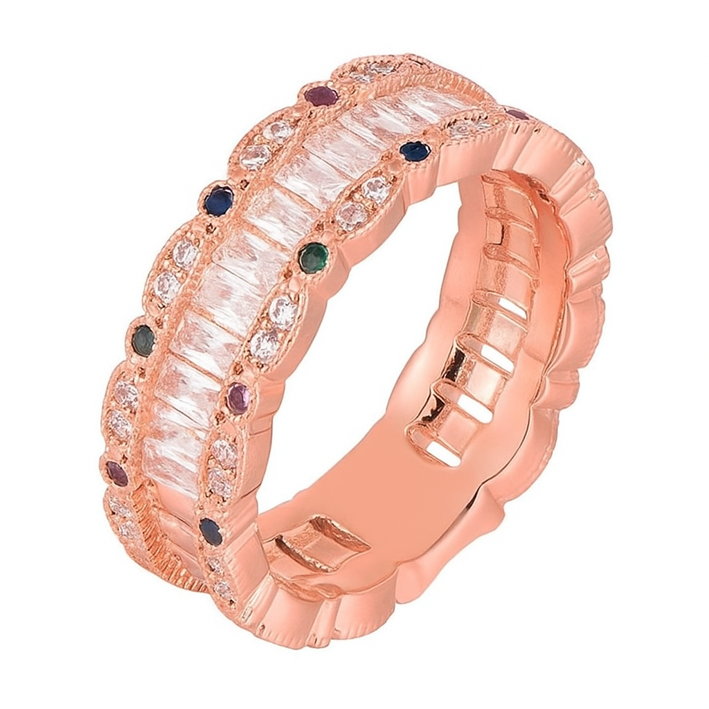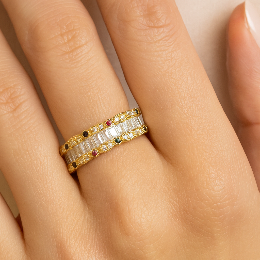 18k yellow, rose, or white gold with bagguette VS1 diamonds and sapphires/emeralds/rubies Bold and regal, this intricate band weaves diamonds with vivid gemstones in a rhythmic, crown-like pattern. A celebration of strength and joy, it embodies a life adorned with color, brilliance, and meaning.