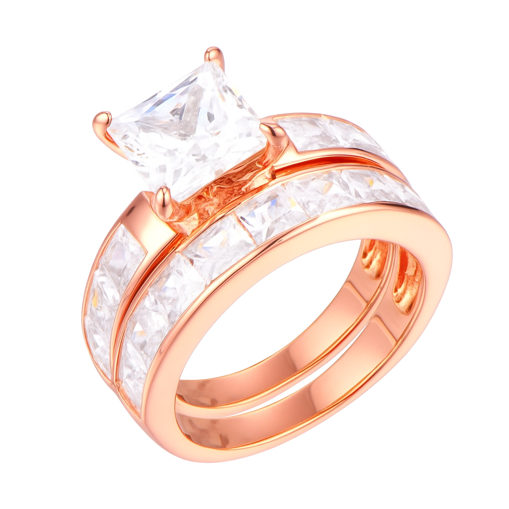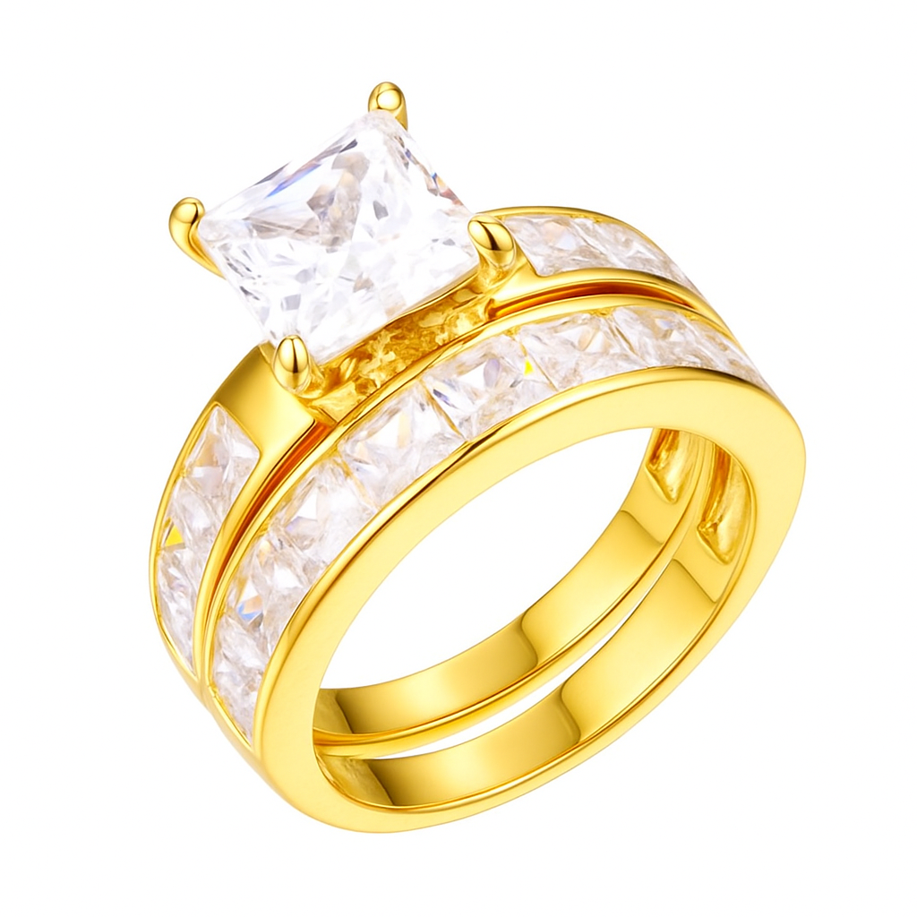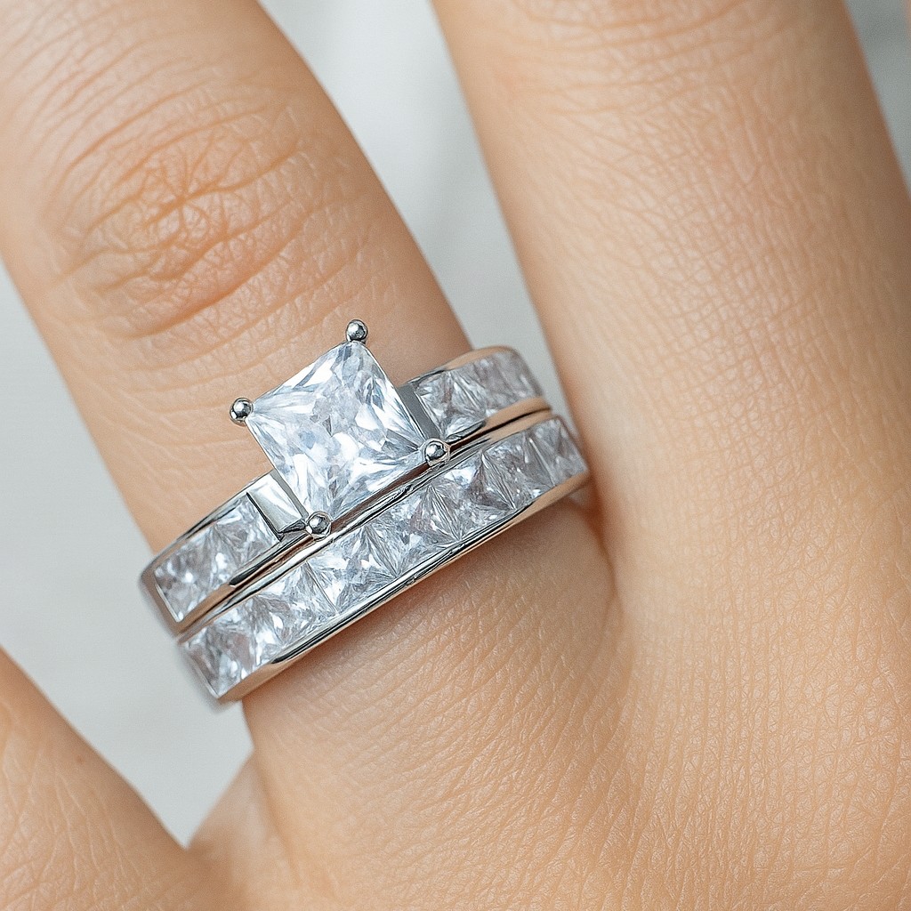 • A bold princess-cut diamond, set atop a regal dual-band of channel-set brilliance. The union of structure and fire creates a statement of majesty — radiant yet modern, strong yet graceful. Available in white, yellow, or rose gold.