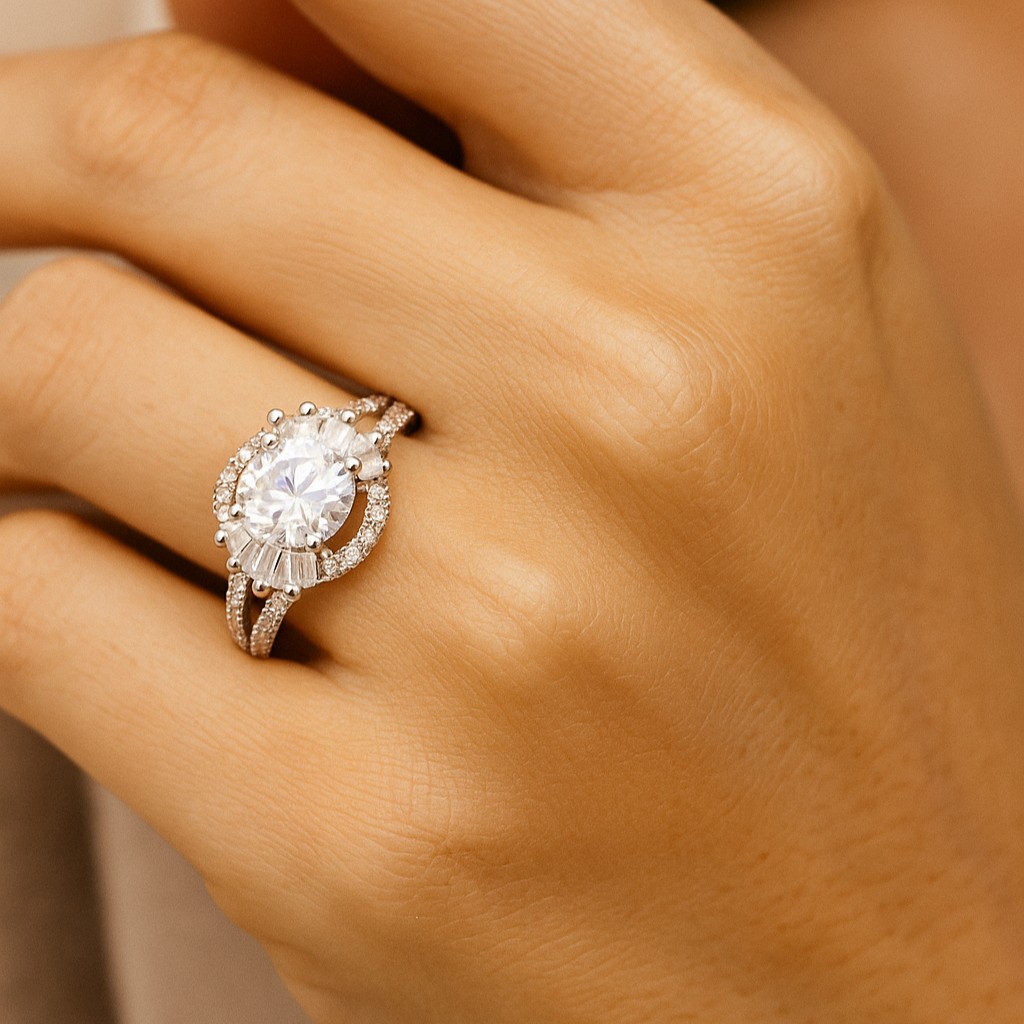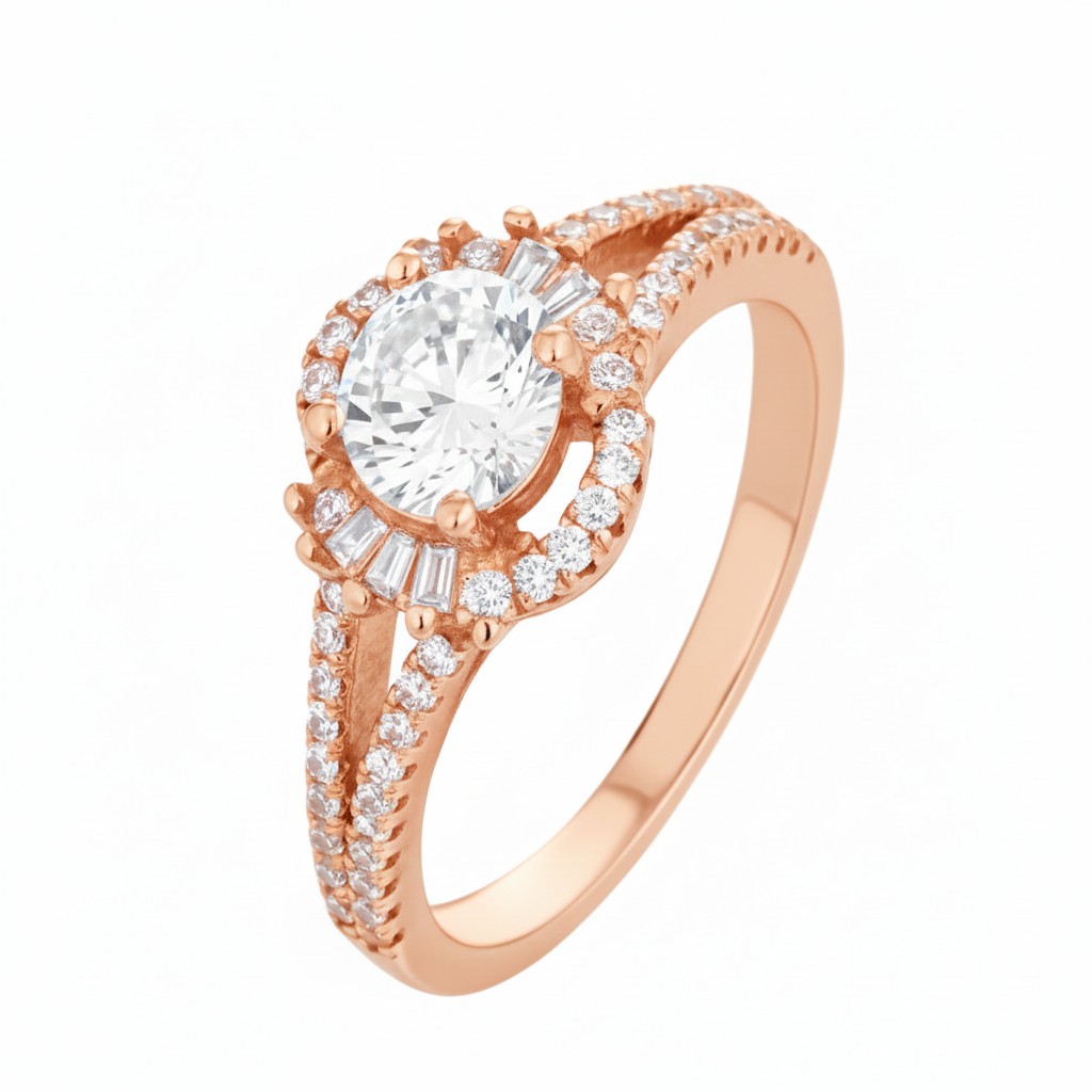 The central solitaire is crowned with a glittering halo, intensifying its brilliance and fire. Pavé diamonds cascade along the band, adding sparkle from every angle. Like a queen’s diadem, it evokes elegance, majesty, and everlasting commitment.