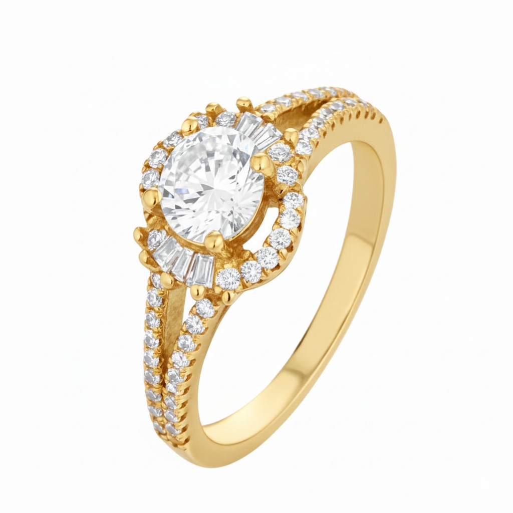 • The central solitaire is crowned with a glittering halo, intensifying its brilliance and fire. Pavé diamonds cascade along the band, adding sparkle from every angle. Like a queen’s diadem, it evokes elegance, majesty, and everlasting commitment.
