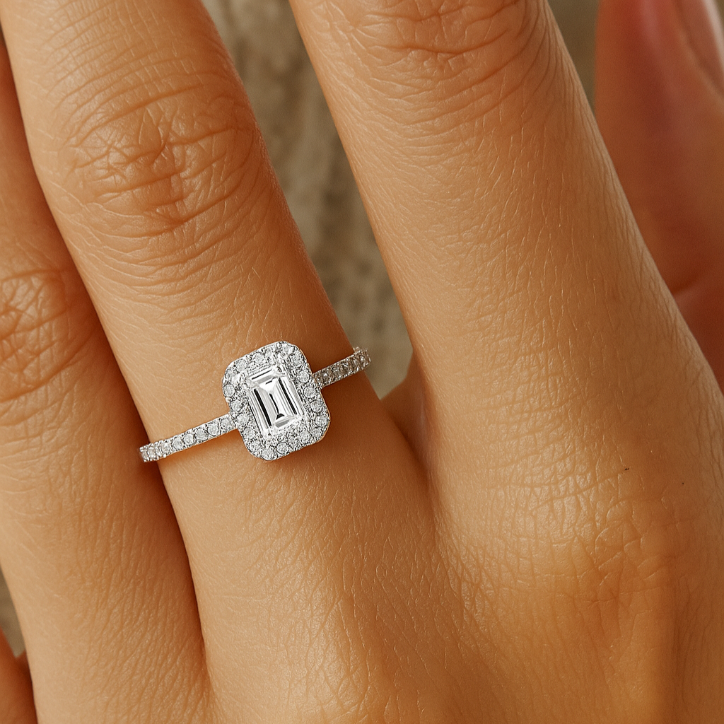 Home “Deco Elegance” Emerald Halo Diamond Ring