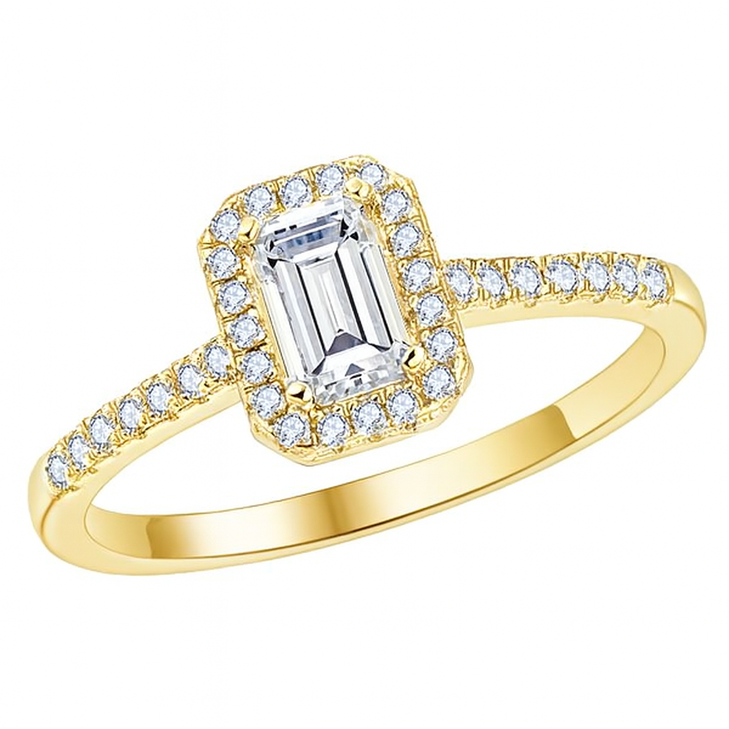 This refined creation features a customizable emerald-cut central diamond framed by a halo of VS1 diamonds along a slender, diamond-paved band. Its geometric precision recalls Art Deco elegance, while the halo enhances the stone’s brilliance with timeless appeal. Available in 18k white, yellow, or rose gold, it is a sophisticated design for the modern romantic.