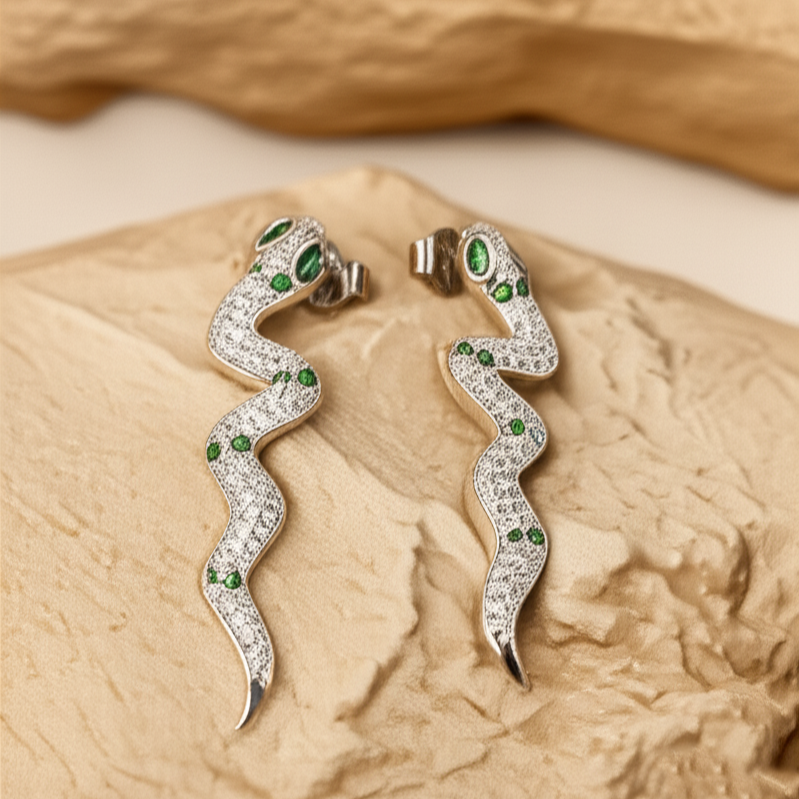 • These statement earrings embody fierce elegance, with serpents crafted in 18K gold that sway gently with every movement. Sparkling VS1 diamonds trace their curves, while deep emerald eyes watch with quiet intensity. Available in white, rose, or yellow gold, they are designed for the woman who embraces both grace and strength.