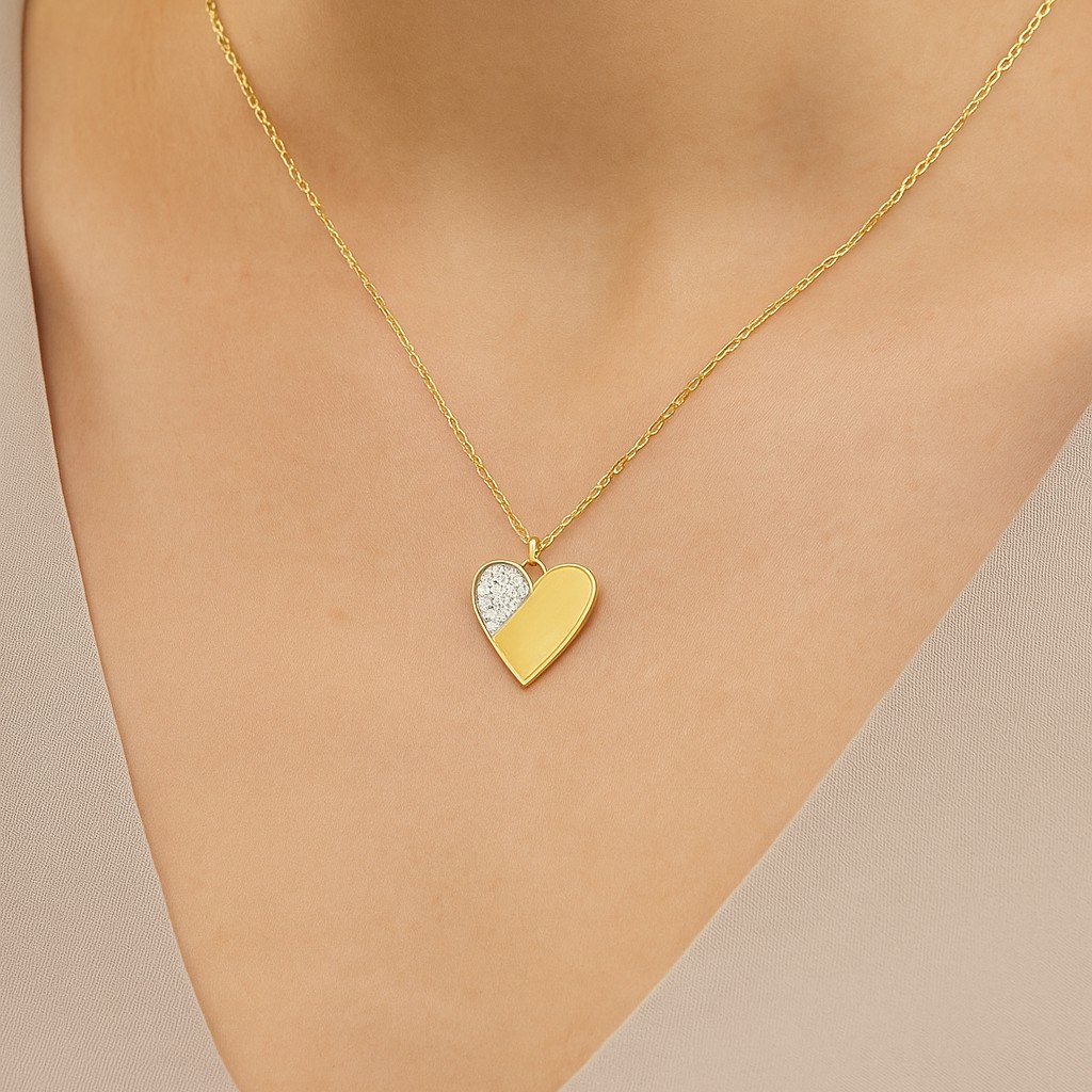 A heart pendant of duality — half polished in glowing gold, half shimmering with VS1 diamonds. This design mirrors the harmony of love’s contrasts: strength and vulnerability, passion and tenderness. A radiant emblem of devotion made eternal in gold.