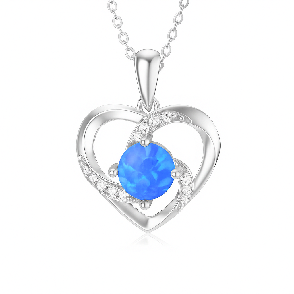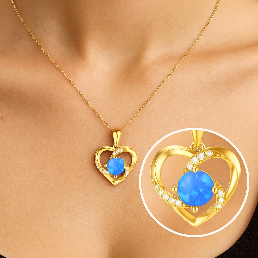 At the heart of this golden embrace glows a fiery blue opal, alive with celestial flashes of color. Surrounding it, a gentle swirl of gold set with VS1 diamonds creates a timeless heart. It is a love that burns endlessly, a flame captured in gemstone brilliance.
