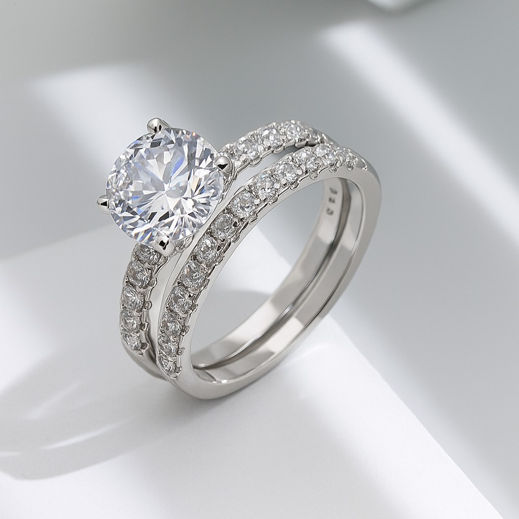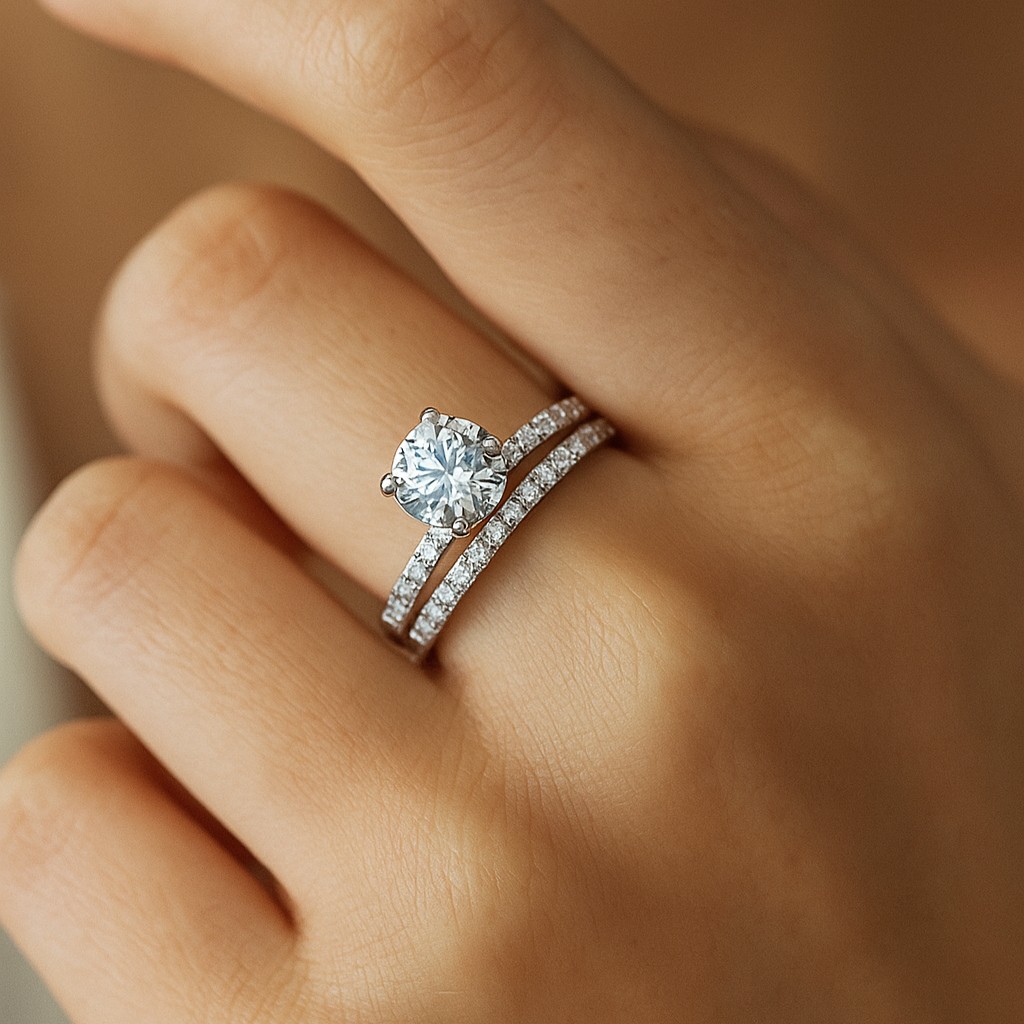 This bridal duo is a seamless union of sparkle and structure. At the center rests a brilliant round solitaire diamond, secured by classic prongs that allow light to dance through every facet. The engagement ring is complemented by a matching diamond band, each stone carefully aligned for maximum brilliance. Together, the set tells a story of unity, love, and enduring partnership — perfect for marking a bond meant to last a lifetime.