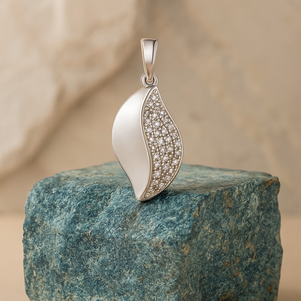 The pendant flows gracefully in an organic wave form, its surface half-smooth, half-pavé set with VS1 diamonds, symbolizing the dance between serenity and sparkle. Suspended delicately, it becomes a talisman of quiet strength and refined femininity.