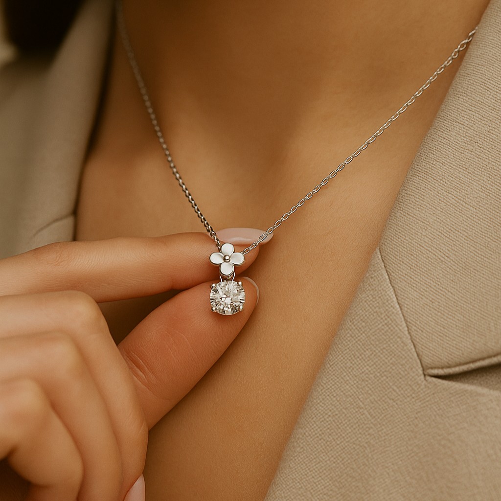 A single gleaming flower anchors a radiant diamond that rests like a drop of dew beneath its petals. Suspended from a delicate chain, the pendant captures both softness and brilliance, making it a versatile yet luxurious piece. A jewel of subtle sophistication, it celebrates the poetry of simplicity elevated to refinement.