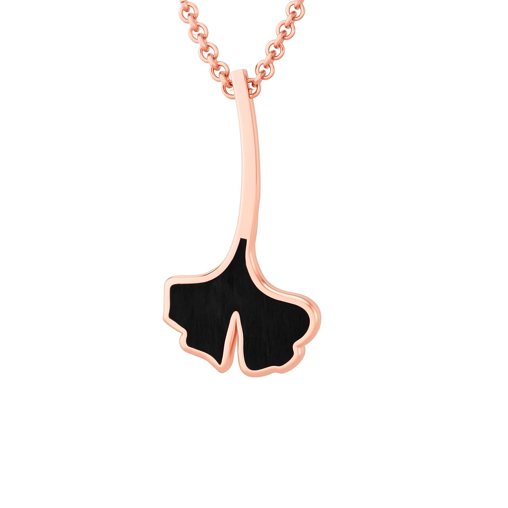 • A single ginkgo leaf rests upon a slender gold stem, transformed into a pendant of sculptural beauty. Measuring 23mm, the pendant balances minimalism with natural artistry, creating a talisman of resilience that can be worn close to the heart. Its bold black enamel contrasts beautifully with polished gold, symbolizing harmony between strength and grace.