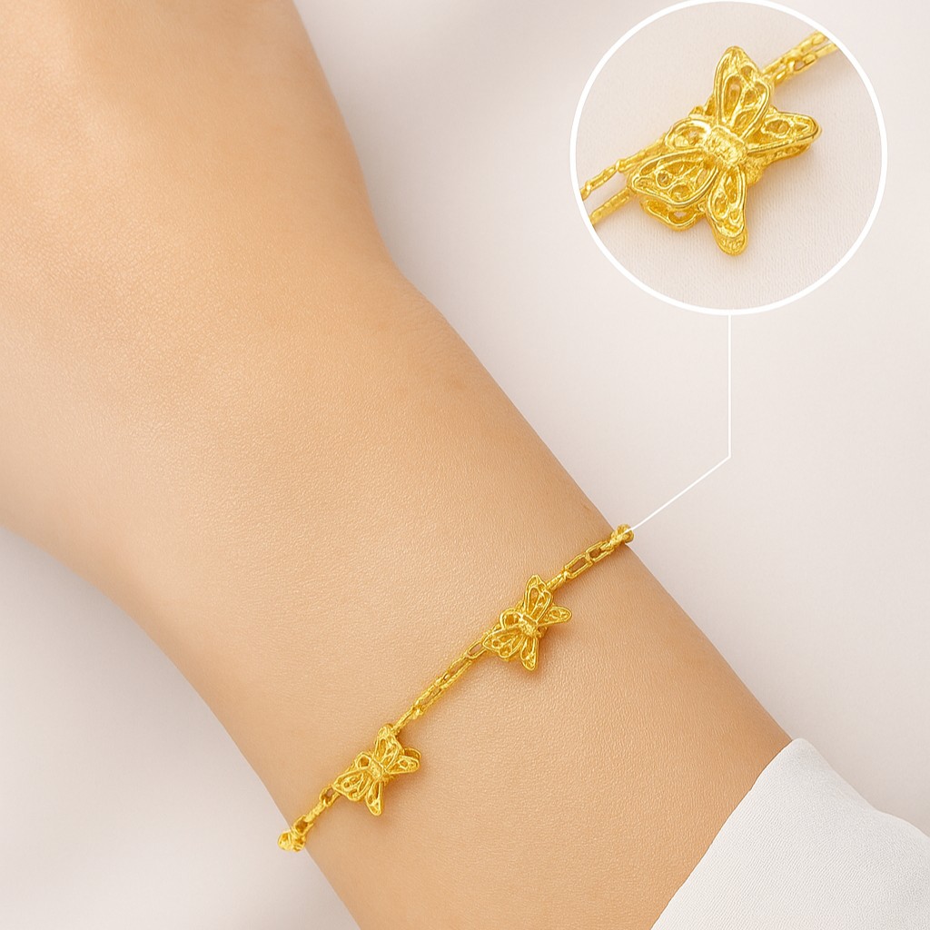 • Celebrate timeless femininity with this beautifully crafted 916 gold bracelet featuring three sparkling bow charms. Each bow reflects a touch of sweetness and sophistication, making it perfect for both everyday wear and special occasions. Its sleek, modern design captures the balance between elegance and playfulness. A heartfelt symbol of beauty, grace, and confidence — designed for the woman who loves to shine effortlessly.