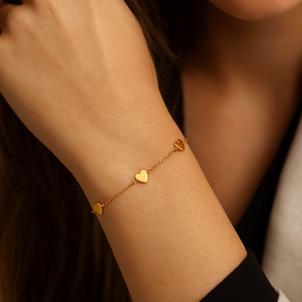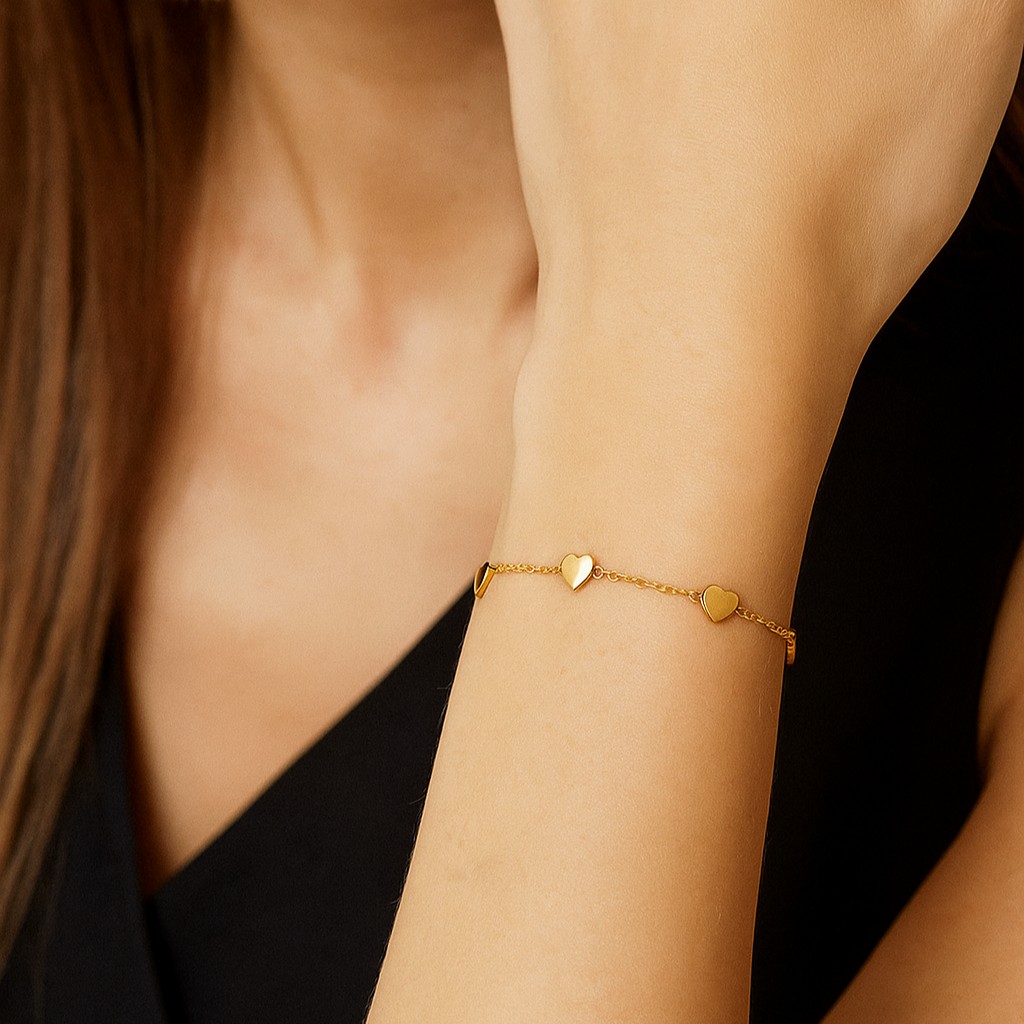 Playful polished heart charms dance along a dainty chain, each reflecting light with tender brilliance. A joyful ode to affection, making it the perfect everyday keepsake of love. Available in all types of gold.