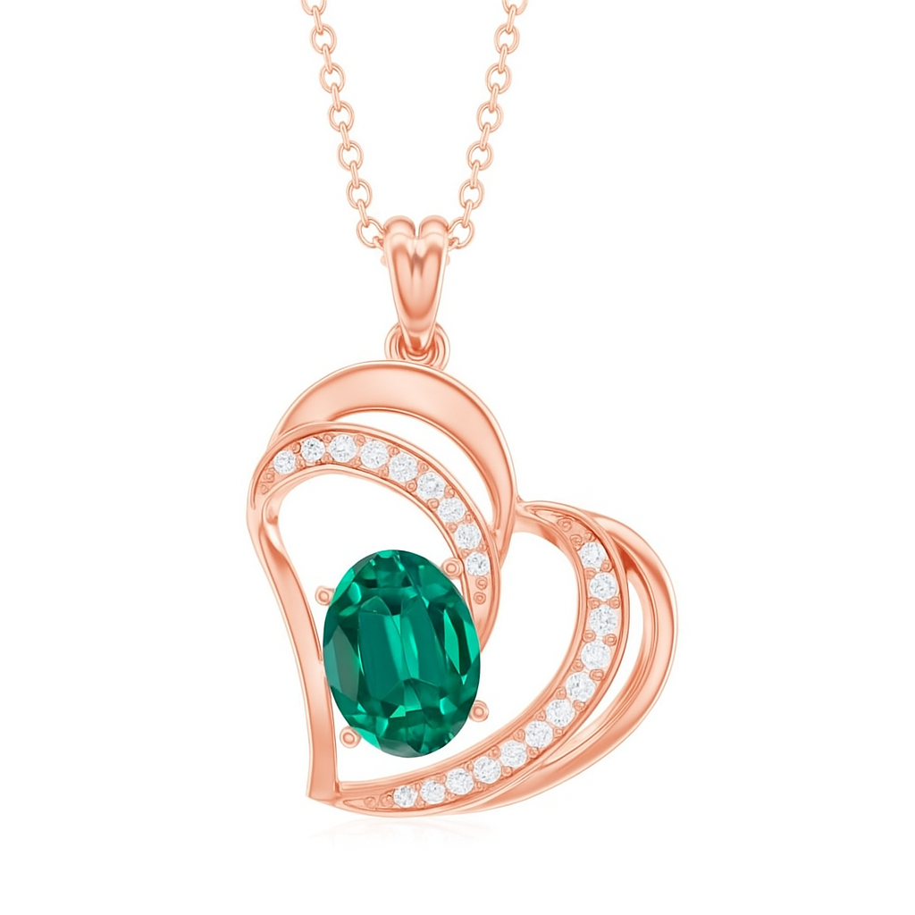A bold oval emerald lies within a sculpted golden heart, accented with a trail of diamonds. The piece symbolizes love rooted in growth and prosperity—a tribute to devotion that flourishes endlessly. Both passionate and serene, this pendant holds love close.