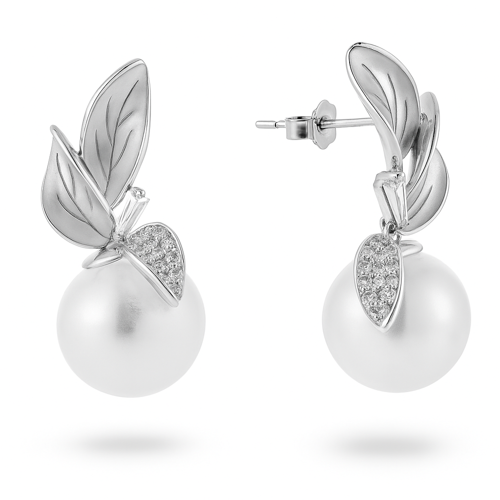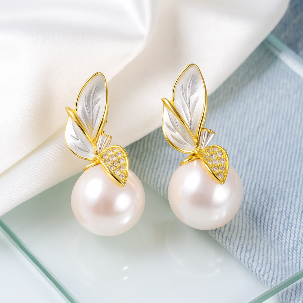 Nature’s poetry meets artisanal mastery in these earrings, where carved mother-of-pearl leaves are paired with diamond-set accents and a radiant freshwater pearl. Each piece whispers of growth, resilience, and serenity—an ode to the beauty of life’s natural rhythm.