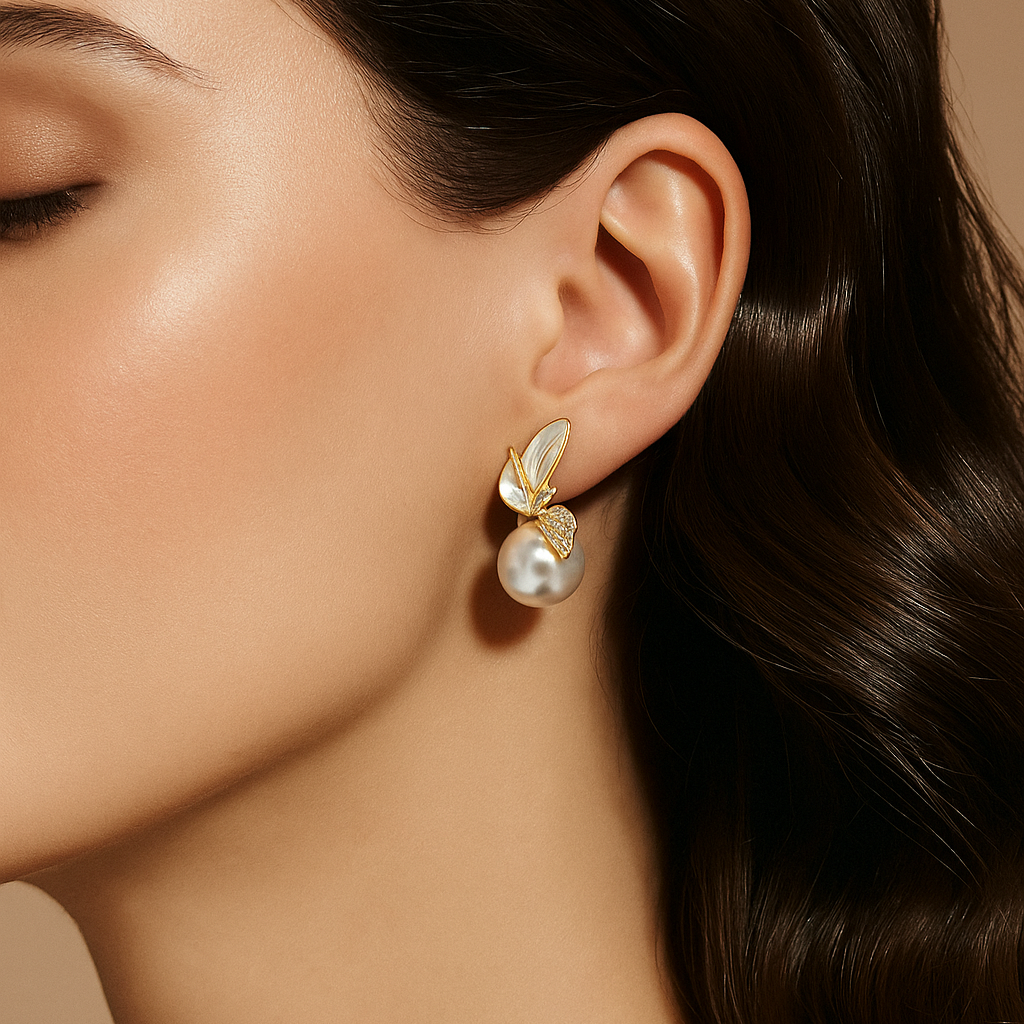 • Nature’s poetry meets artisanal mastery in these earrings, where carved mother-of-pearl leaves are paired with diamond-set accents and a radiant freshwater pearl. Each piece whispers of growth, resilience, and serenity—an ode to the beauty of life’s natural rhythm.          “The Eternal Bloom Collection”