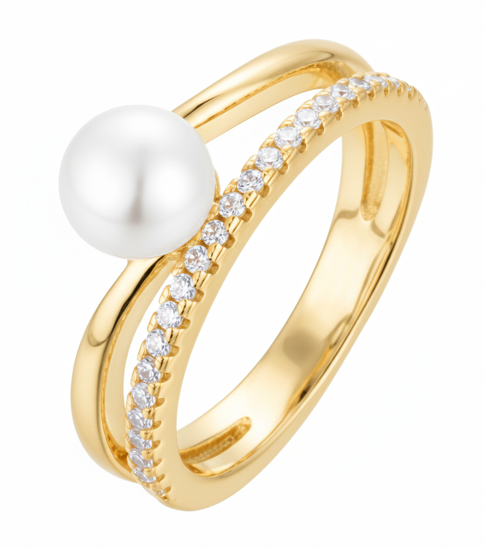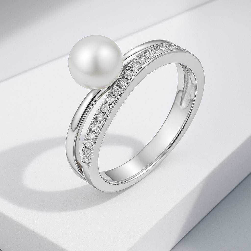 A single pearl poised upon a split diamond band — contemporary, sculptural, and refined. The piece celebrates modern femininity, balancing strength and softness in a luminous statement of grace.