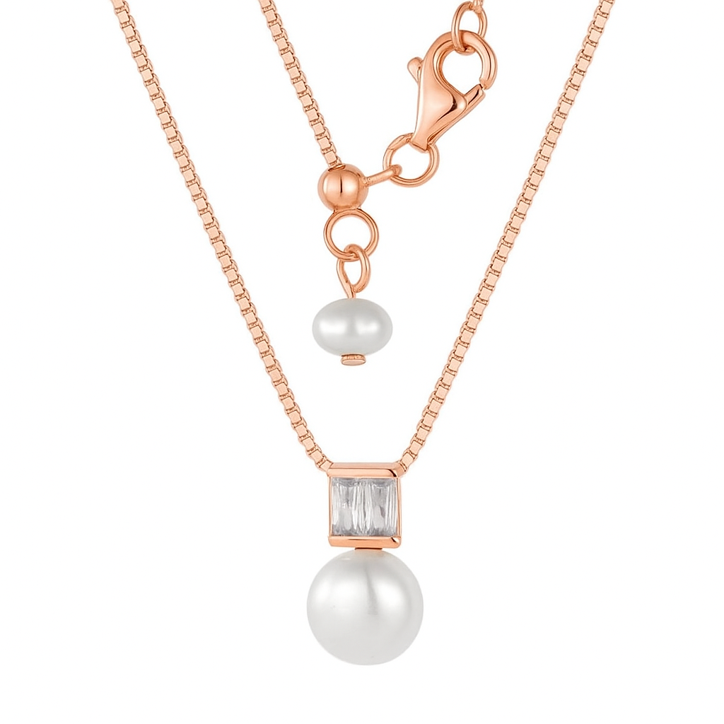 An elegant pearl pendant suspended beneath a radiant square-cut diamond on a delicate chain. A timeless union of purity and brilliance, it whispers of refined femininity and the quiet luxury of heritage elegance.