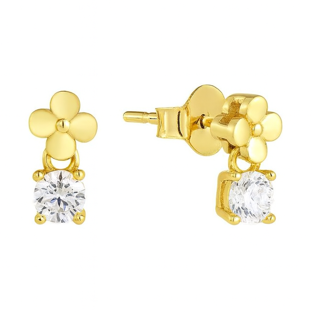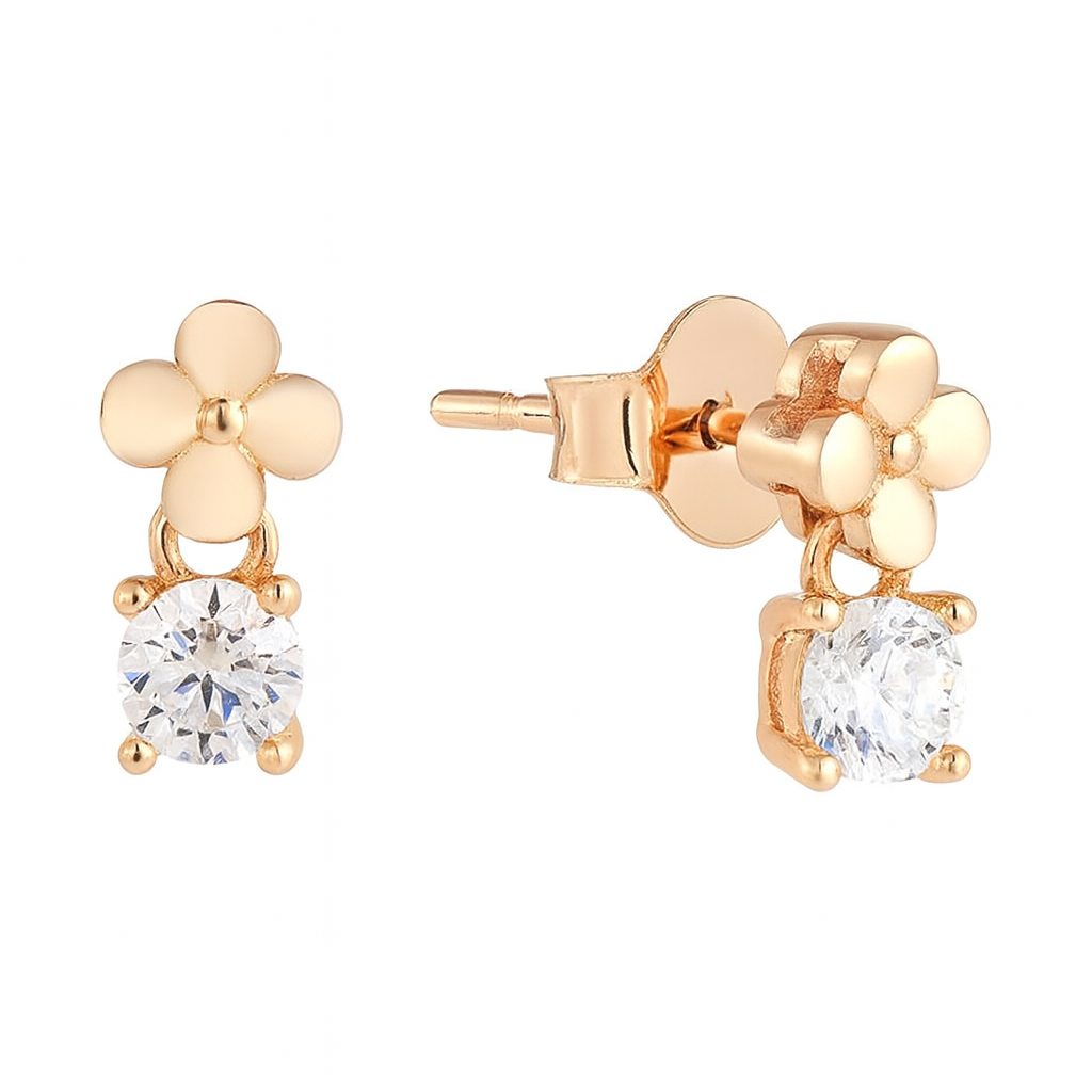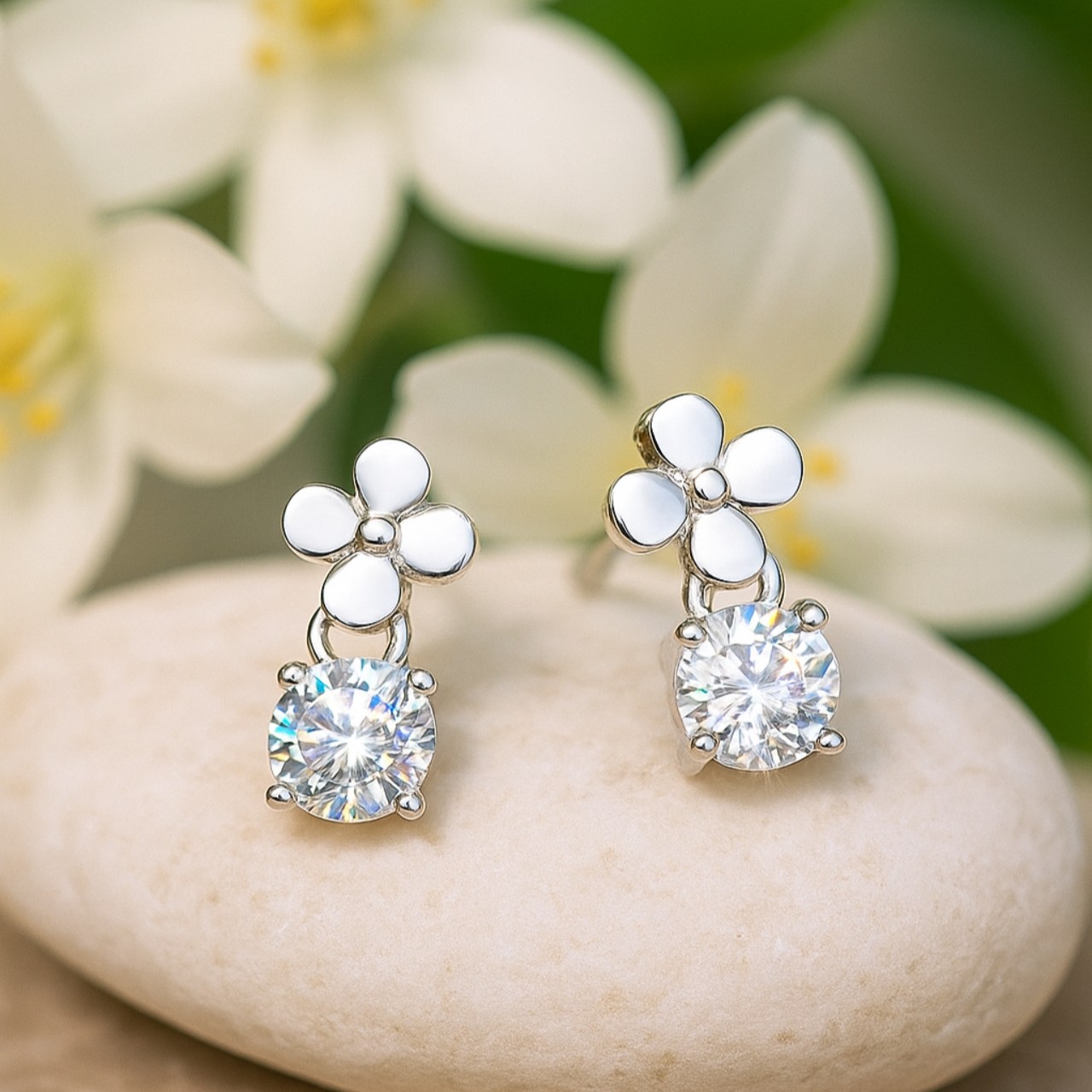 Graceful and charming, these earrings feature a delicate floral motif accented with a brilliant diamond drop. The refined simplicity of the design speaks of quiet elegance, making them perfect for both everyday sophistication and timeless celebrations.