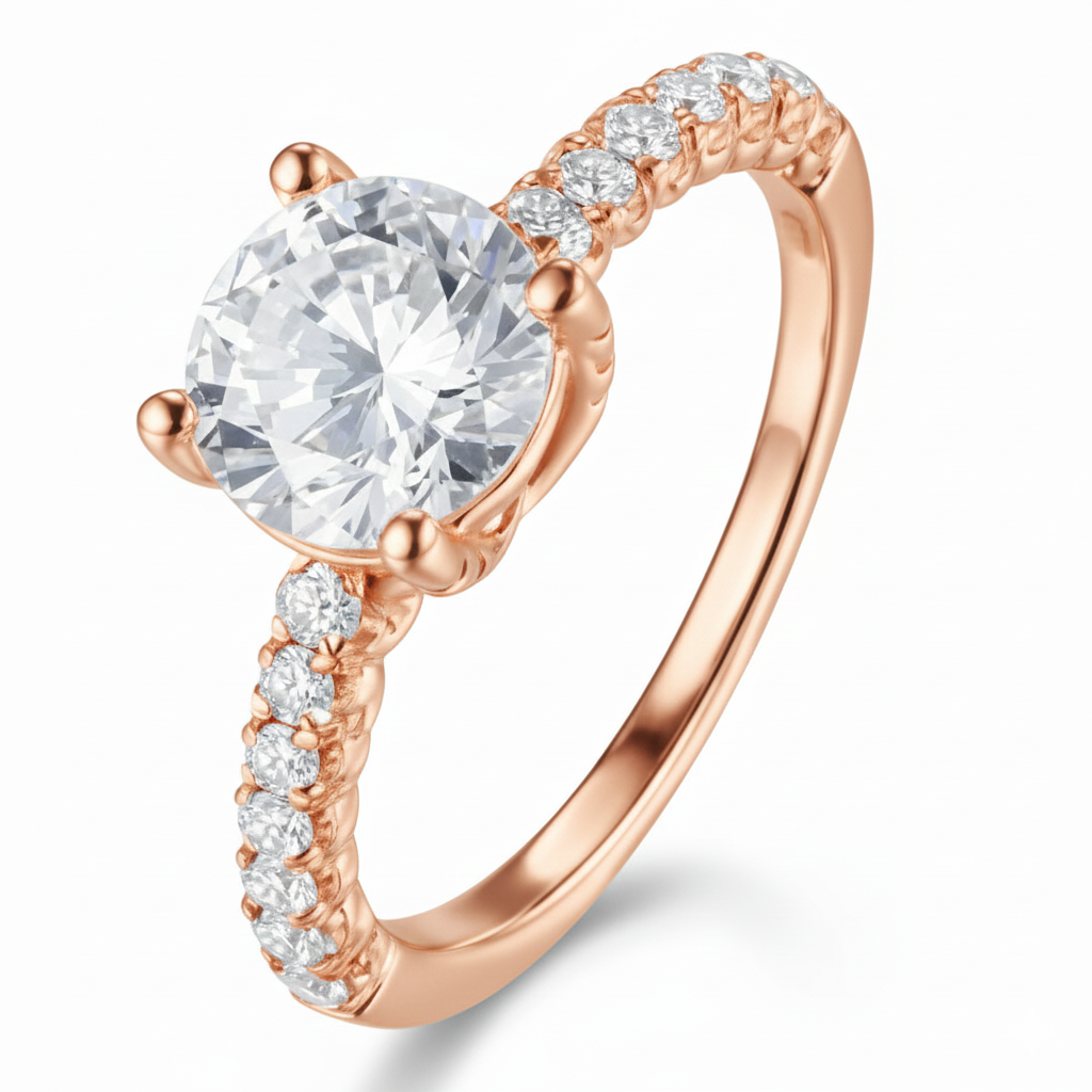 A solitaire masterpiece crowned with a brilliant round diamond, lifted on a shimmering pavé band. Every angle reflects an unyielding promise of light, making it a timeless symbol of devotion and everlasting beauty