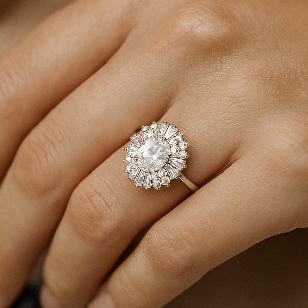 A luminous centerpiece surrounded by a double halo of round and baguette-cut diamonds, this ring symbolizes light in motion. The customizable center stone allows you to make the brilliance your own—whether diamond, sapphire, emerald, or another gem of choice. A true statement of grace and refinement.