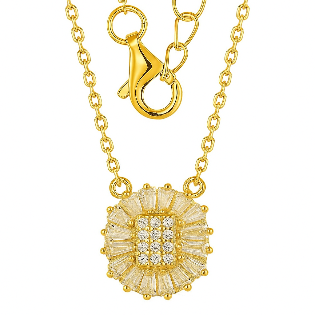 • A striking expression of brilliance, this necklace features a sunburst-inspired pendant of baguette and round VS1 diamonds arranged in a dazzling halo. Crafted in 18K gold, available in white, yellow, or rose, it is designed to catch the light with every movement for an unforgettable sparkle.