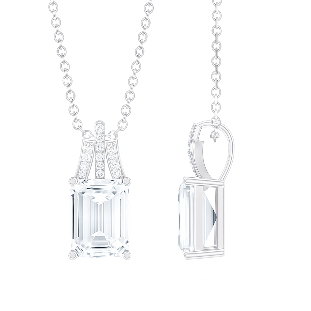 An emerald-cut diamond, held within an architectural crown of VS1 diamonds, radiates stately elegance. The structured design is both timeless and contemporary, evoking grandeur and poise. A pendant that commands presence and admiration.