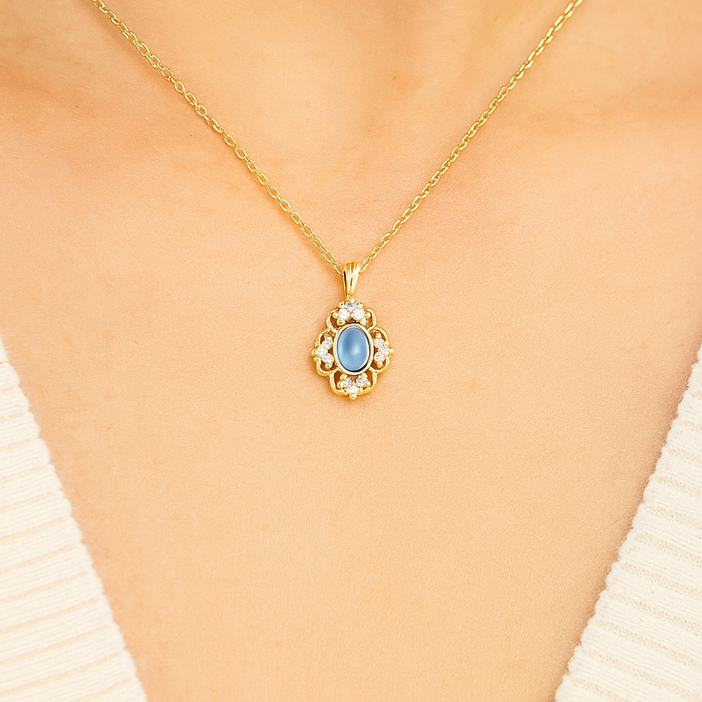 An oval-cut blue gemstone lies at the heart of this ornate pendant, framed by intricate golden details and brilliant diamonds. Regal and striking, it embodies wisdom, power, and a horizon filled with promise.