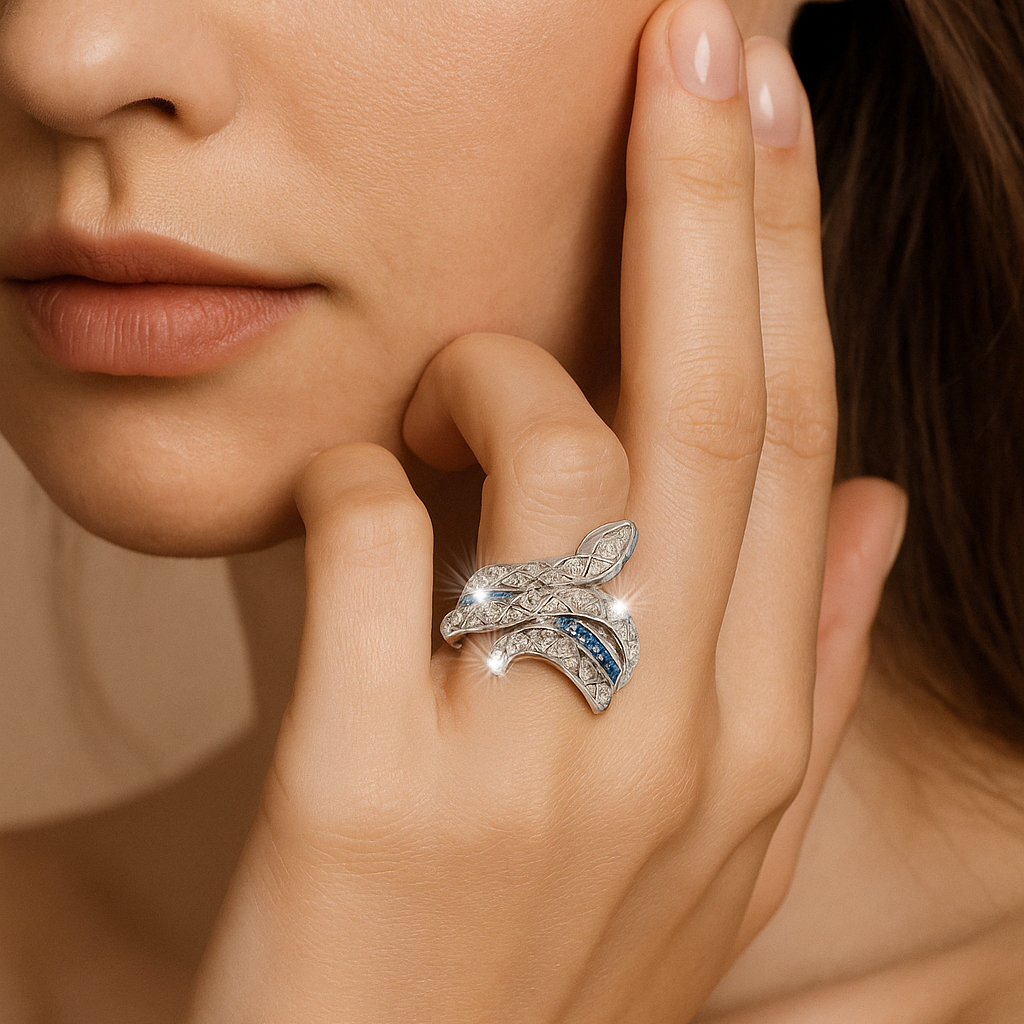 A sculptural masterpiece, this serpent-inspired design coils around the finger in 18k gold, ablaze with VS1 diamonds and a striking line of vivid sapphires. It symbolizes wisdom, transformation, and eternal renewal, delivering an aura of mystery and power to its wearer.