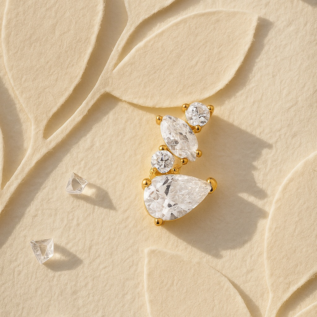 • A vertical trail of mixed cuts descends like falling stardust, glimmering with every turn of the head. The Starlit Cascade earrings bring celestial elegance to life, offering fluid sparkle with modern refinement.