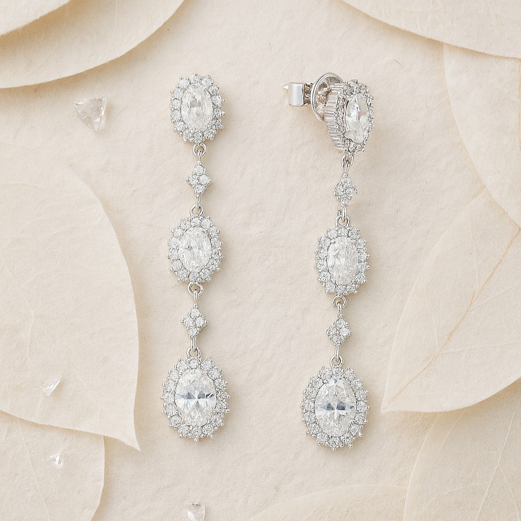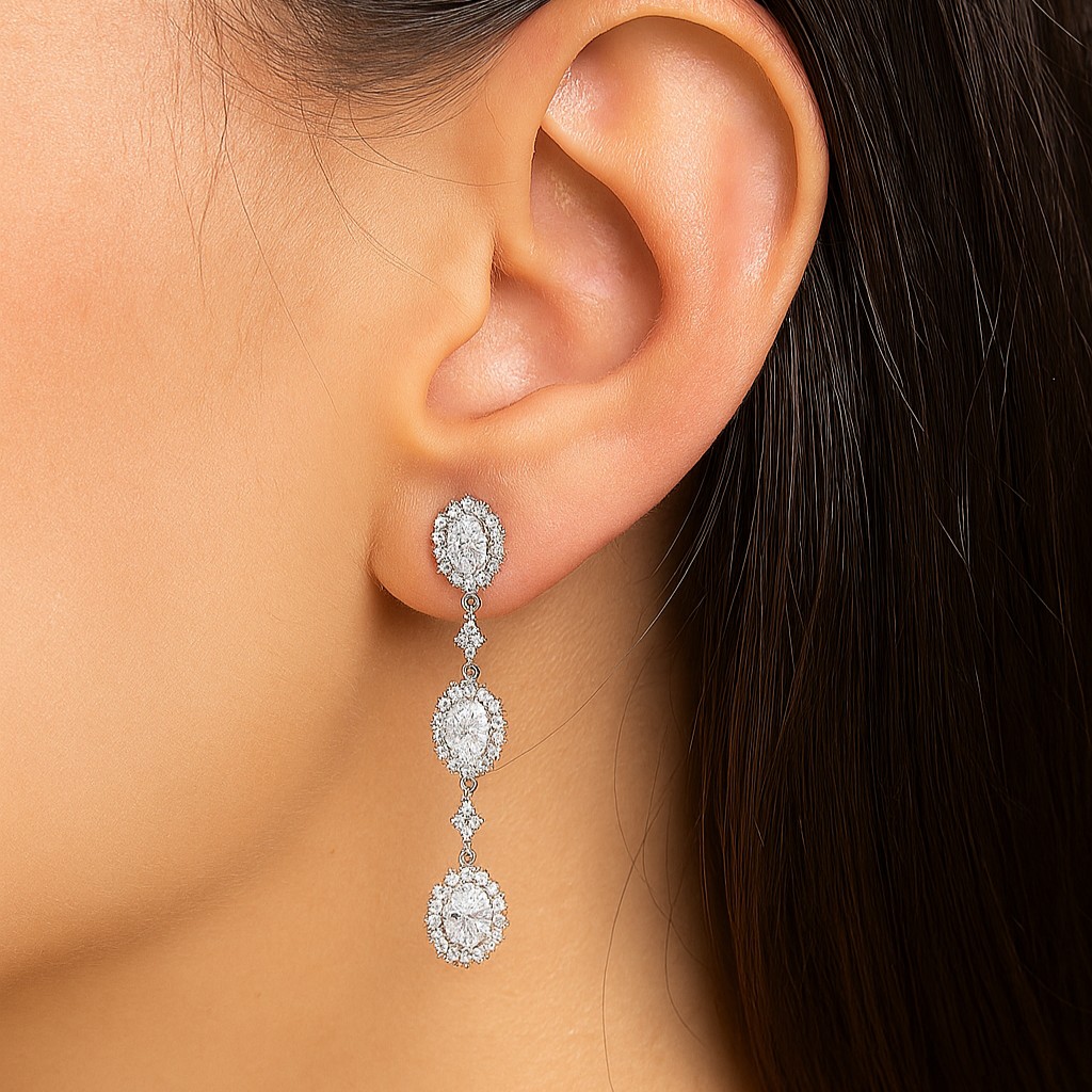 Long, graceful lines of oval-cut stones descend like a constellation falling across the night sky. Each gem is framed by a delicate halo, reminiscent of glowing stars shimmering in harmony. The movement of these earrings enhances their brilliance, catching the light with every turn of the head. A statement of celestial opulence, they elongate the neck with refined elegance.