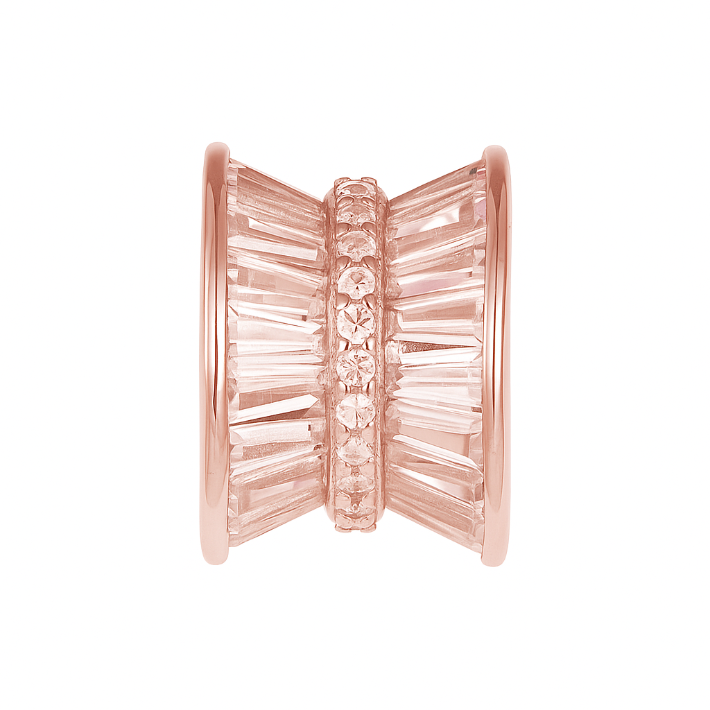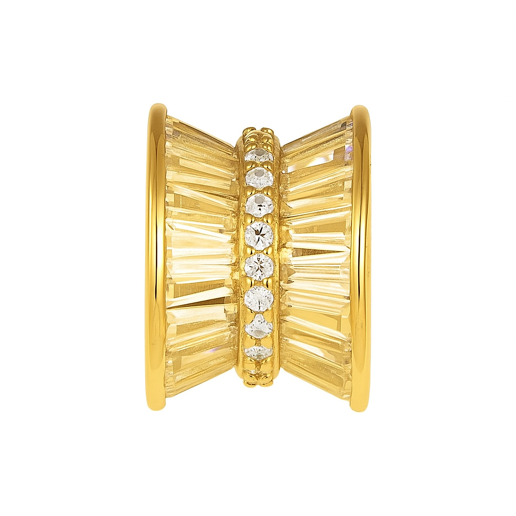 A sculptural creation featuring mirrored rows of baguette-cut stones joined by a sparkling diamond band. This charm balances architectural precision with radiant elegance, embodying harmony, symmetry, and strength.