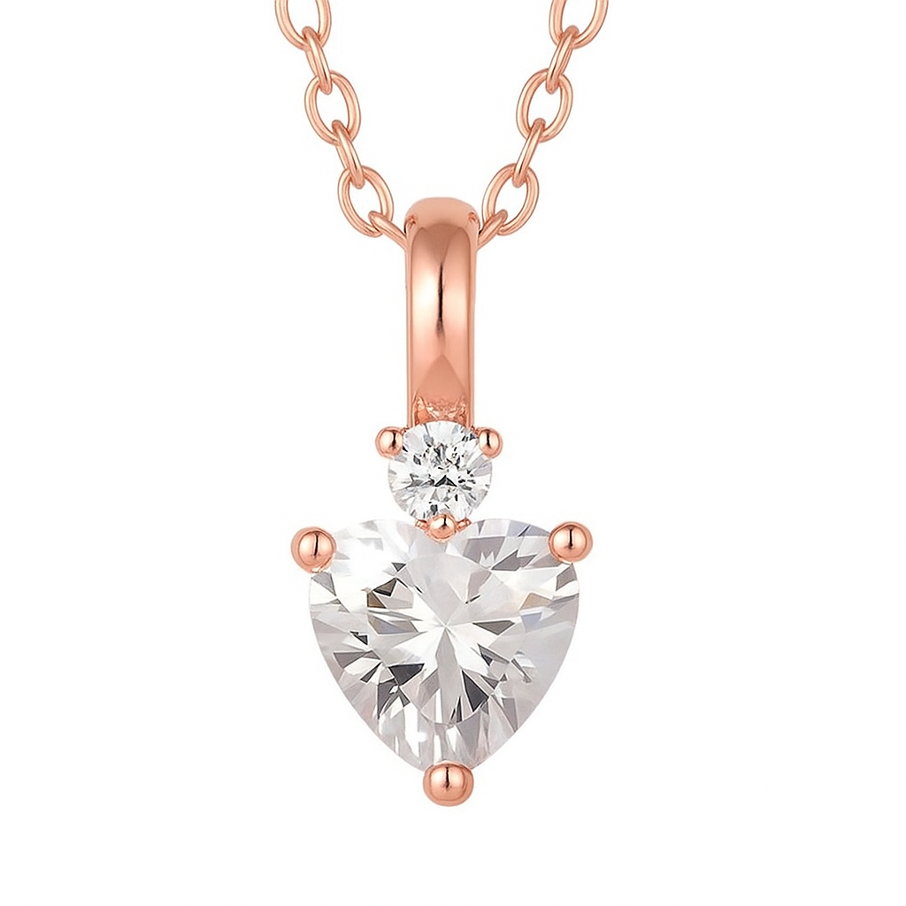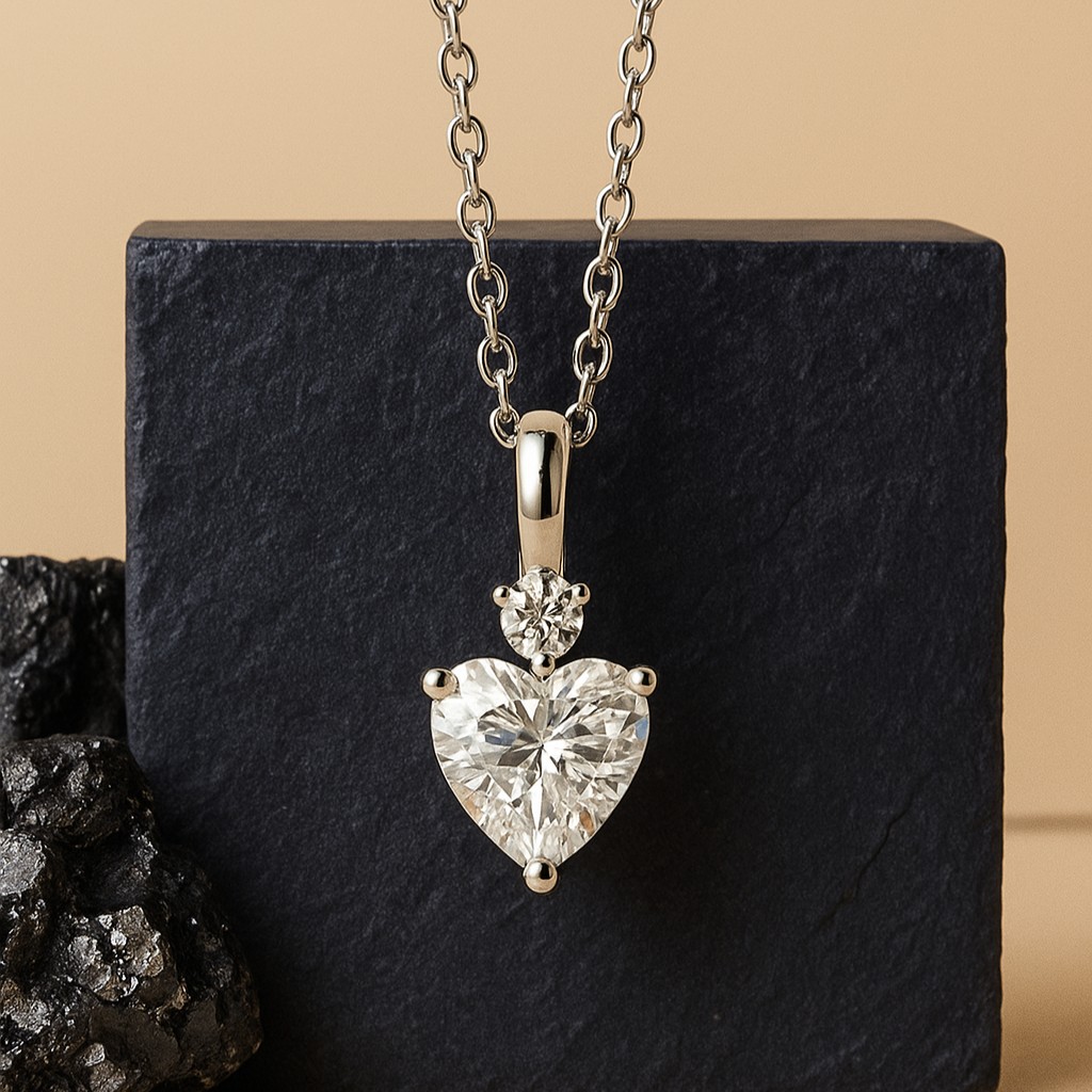 • This pendant is a tender declaration of everlasting affection, where a luminous heart-shaped diamond rests gracefully beneath a brilliant round cut. The interplay of the two stones speaks of passion and purity, entwined in a delicate balance. Suspended from a fine chain, it radiates with quiet elegance, making it an intimate piece that rests close to the heart. Customizable in carat weight and available in white, rose, or yellow gold, it is a jewel that adapts to every love story while keeping its essence of eternal devotion.