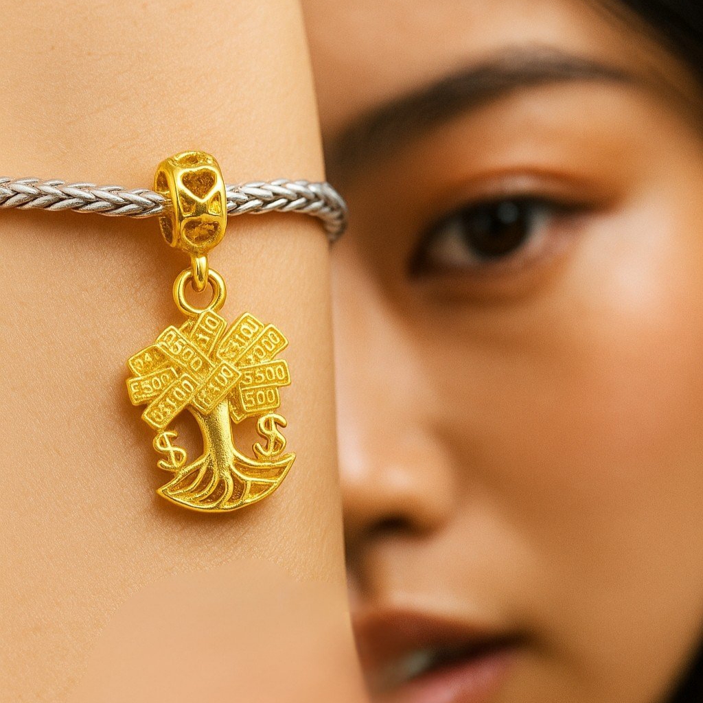 • This spectacular gold charm is an emotional and opulent statement, featuring a Money Tree laden with currency symbols, dangling from a bold 10mm heart-shaped bail. The piece brilliantly symbolizes continuous growth, abundant wealth, and love, making it a powerful modern talisman. Wear this sophisticated charm as a luxurious, daily affirmation of your financial and emotional aspirations.