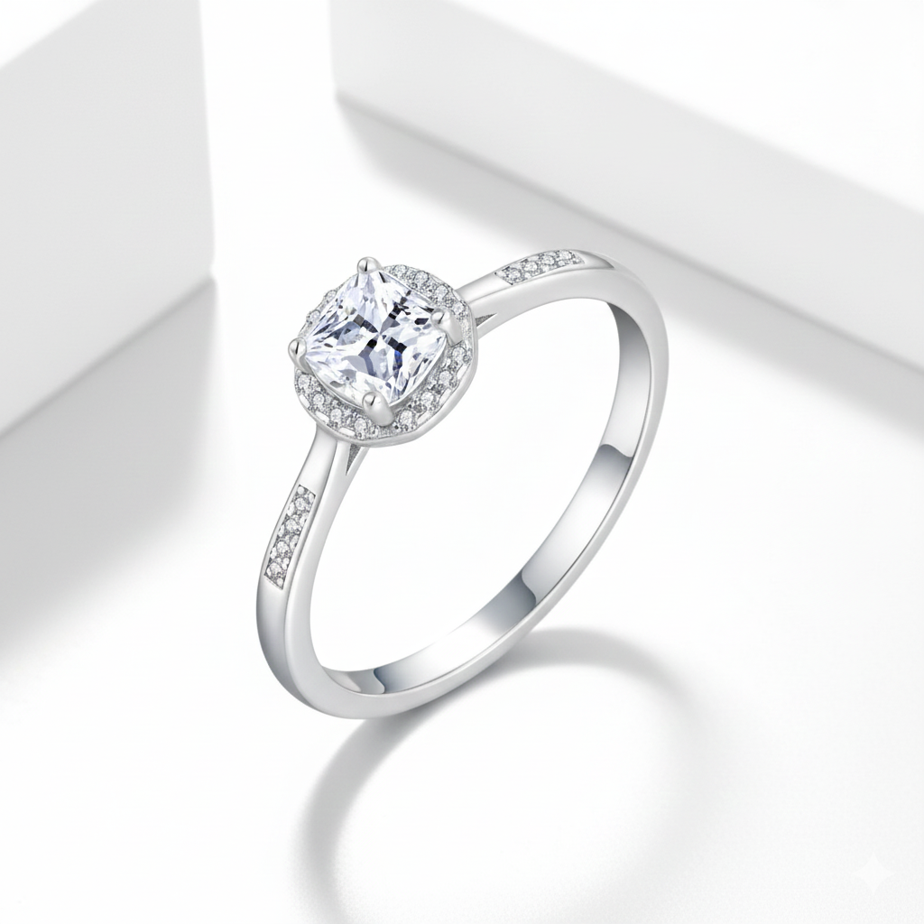 • At the heart of this design is a sparkling cushion-cut diamond, encircled by a halo of smaller diamonds that amplify its brilliance. The band features graceful pavé detailing along the shoulders, adding extra fire and charm. Its clean silhouette blends classic tradition with a contemporary edge, making it versatile for both daily wear and momentous occasions. It is a piece that embodies timeless beauty and quiet sophistication.