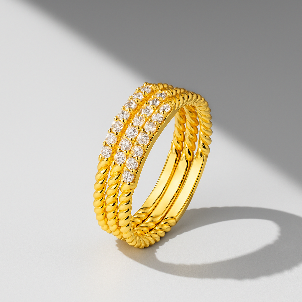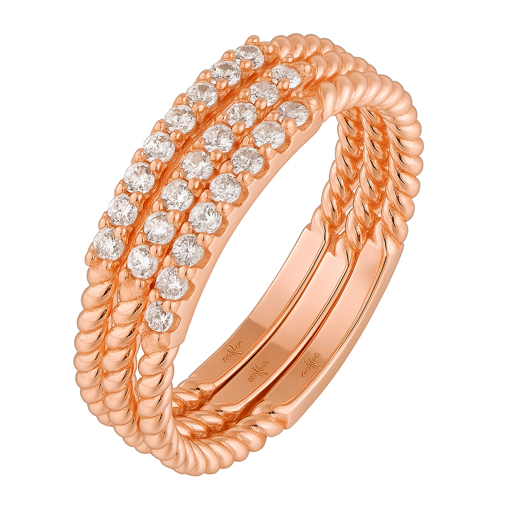 – Available in white, yellow, rose gold This 18K gold ring intertwines polished rope textures with rows of VS1 diamonds, blending craftsmanship with brilliance. A timeless band that represents resilience and connection.